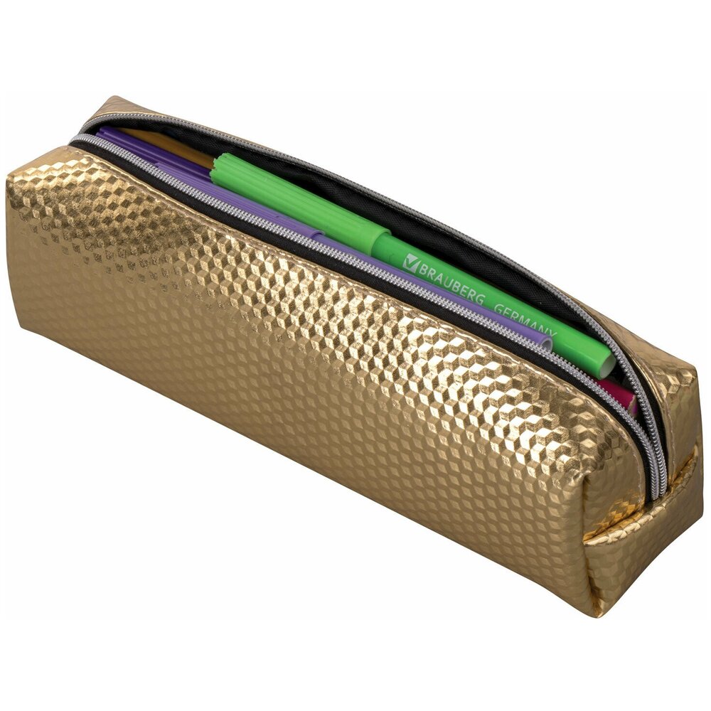 Пенал-косметичка BRAUBERG выполнен из фактурного блестящего ПВХ. Надежная молния оснащена металлическим брендированным бегунком. Внутри пенала подкладка из полиэстера.