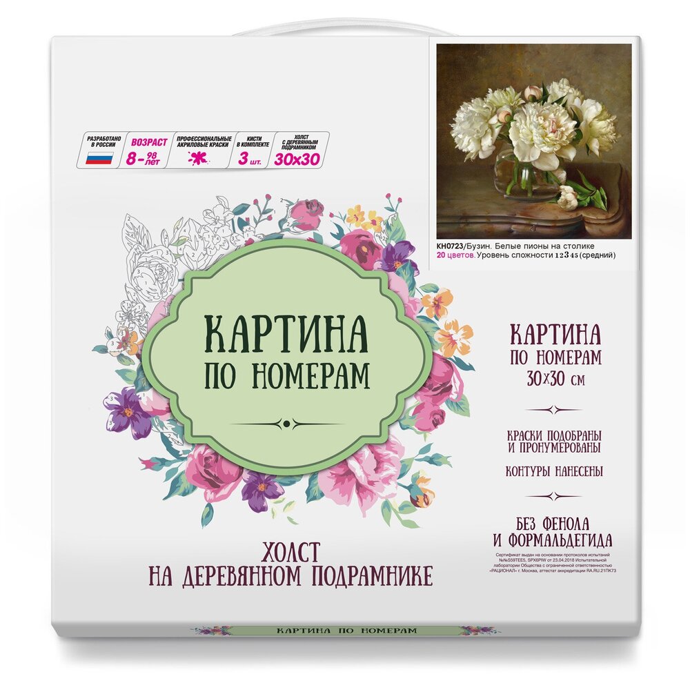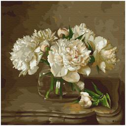 В этом наборе есть все, чтобы создать потрясающе красивую картину художника Игоря Бузина "Белые пионы на столике", изображающую букет пышных пионов в прозрачной вазе. Следуя инструкции и сверяясь с цветовой схемой рисунка, шаг за шагом заполняется холст с уже нанесенными контурами. Вначале стоит заполнить крупные элементы, следуя по направлению сверху вниз, затем при помощи кисти меньшего размера раскрасить остальные детали.<br />Раскрашивая картину по номерам, можно потренировать навыки мелкой моторики, усидчивость и цветовое восприятие, а готовый рисунок станет настоящим украшением интерьера.