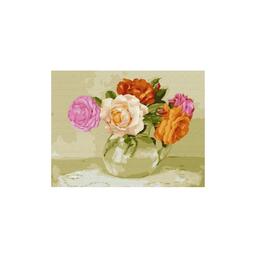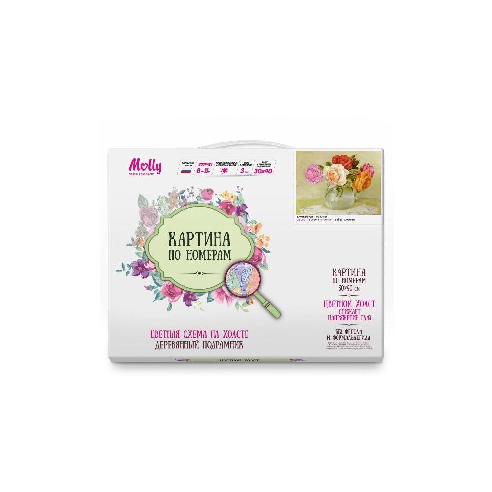 Размер изделия: холст 30х40 см<br />Состав: холст, дерево, акриловые краски, нейлон<br />Возраст: от 8 лет Уровень сложности: 3 - средний<br />Упаковка: коробка<br />Комплектация: 3 кисти разного размера, холст на подрамнике, акриловые краски<br />Страна изготовления: Россия<br />В этом наборе есть все, чтобы создать потрясающе красивую картину художника Игоря Бузина "Розочки", изображающую букет цветных роз в прозрачной вазе. Следуя инструкции и сверяясь с цветовой схемой рисунка, шаг за шагом заполняется холст с уже нанесенными контурами. Вначале стоит заполнить крупные элементы, следуя по направлению сверху вниз, затем при помощи кисти меньшего размера раскрасить остальные детали.<br />Раскрашивая картину по номерам, можно потренировать навыки мелкой моторики, усидчивость и цветовое восприятие, а готовый рисунок станет настоящим украшением интерьера.