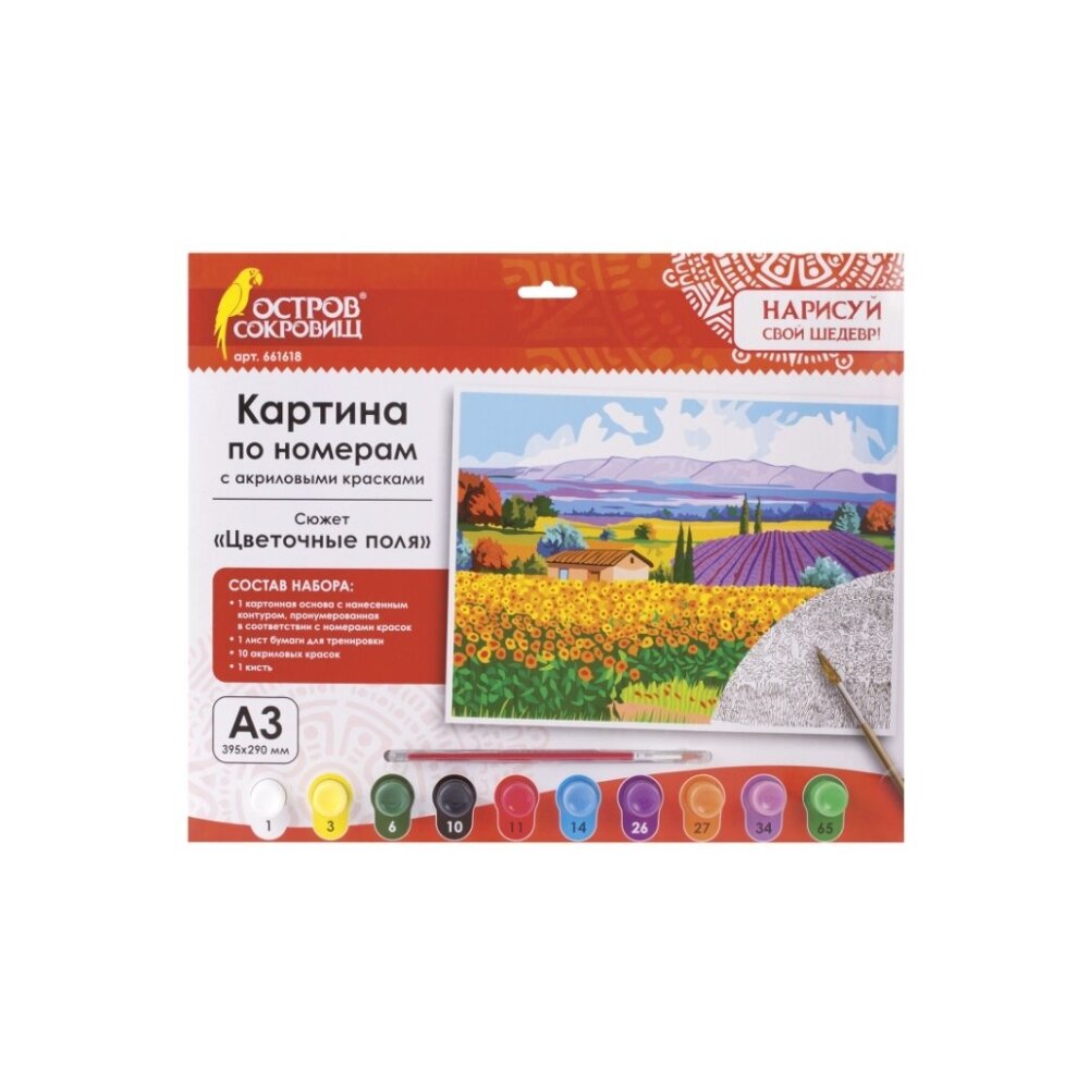 Картина по номерам ОСТРОВ СОКРОВИЩ – это отличный способ почувствовать себя художником и интересно провести время всей семьей. Работа над картиной развивает внимательность, усидчивость, аккуратность. В набор входит: 1 картонная основа с контуром, 1 лист бумаги для тренировки, 10 акриловых красок объемом 3 мл каждая и синтетическая кисть. Формат основы - А3 (395х290 см).