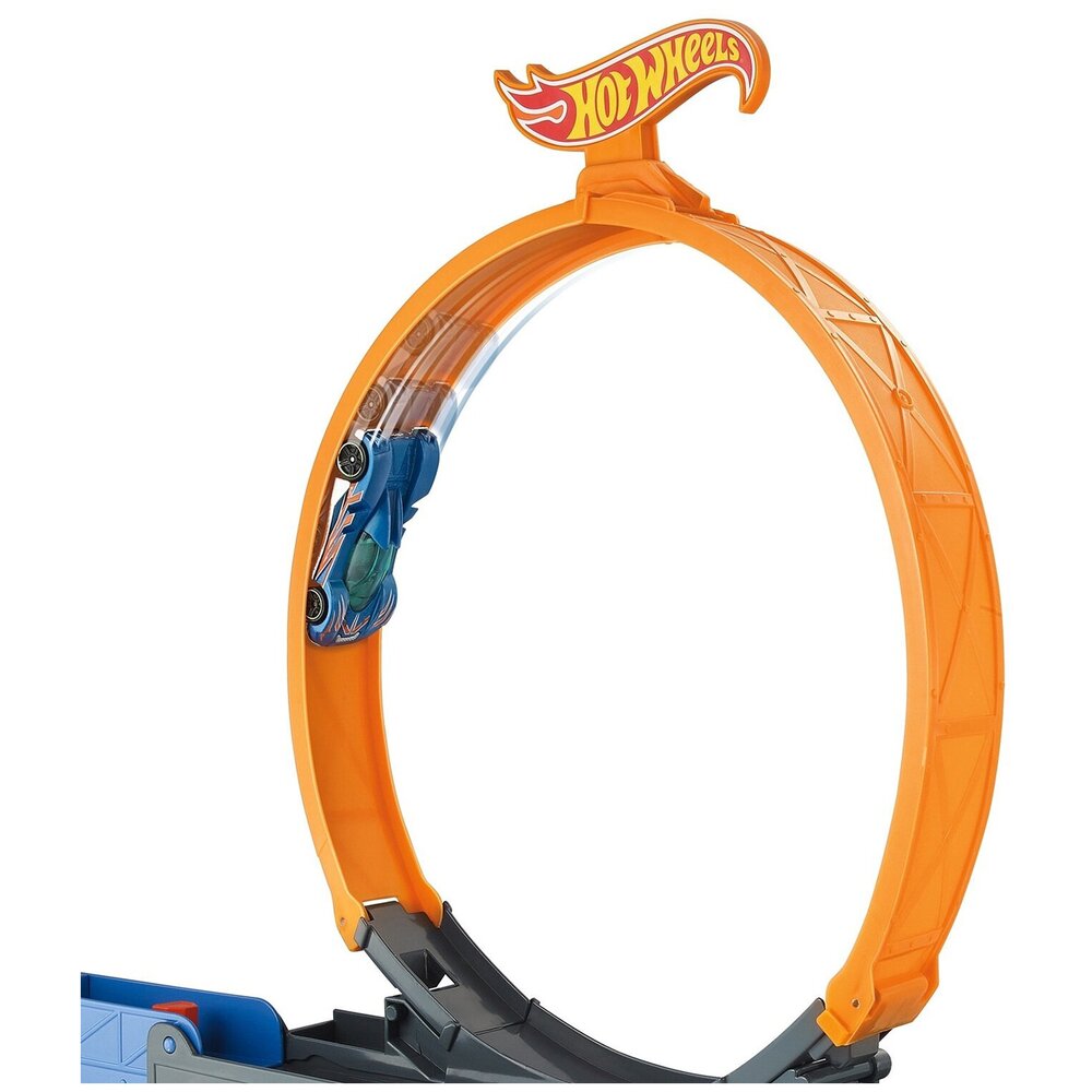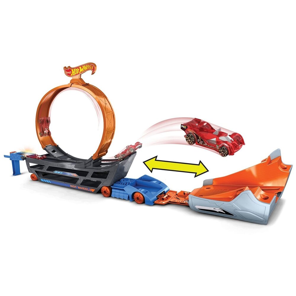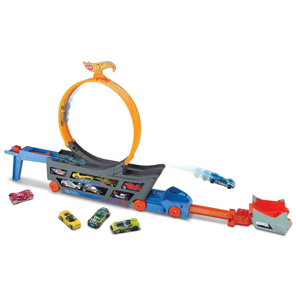 Грузовик станет замечательным подарком всем любителям машинок Hot Wheels. Вместе с ним ваш ребёнок сможет провести множество часов весёлых игр. Грузовик вмещает в себя 18 маленьких машинок (каждая продаётся отдельно). При установке трюковой петли появляется возможность запускать машинки в невообразимые и удивительные трюки. Для их запуска пусковая установка имеет 4 скорости. А вместе со своими друзьями малыш сможет устроить соревнования, чей трюк станет самым классным.
