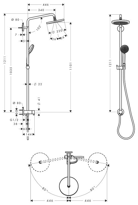 - Дополнительная информация высота стойки для душа: 1211 мм; диаметр душевой лейки: 100 мм; диаметр верхнего душа: 220 мм
