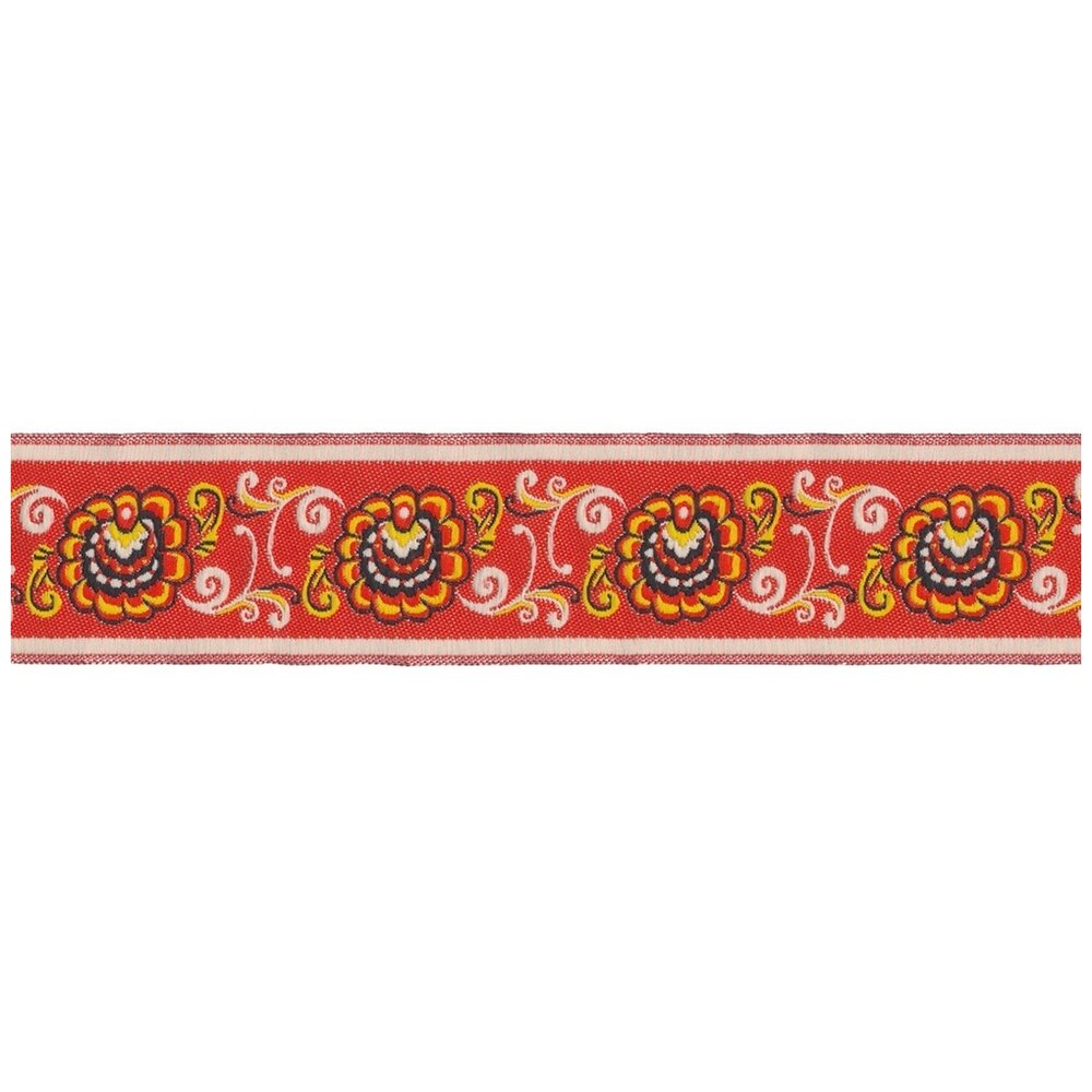Жаккардовая лента с растительным орнаментом-это лента с рисунком, который не наносится сверху, а образуется плетением нитей самой тесьмы, и благодаря этому никогда не сотрется и не поблекнет. Жаккардовая лента выглядит как вышивка гладью, и придает фольклорный колорит любому изделию. Используется в качестве декоративного элемента при производстве одежды, художественных изделий, сувенирной атрибутики и т.п.