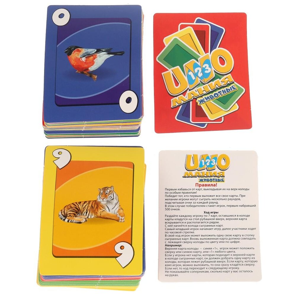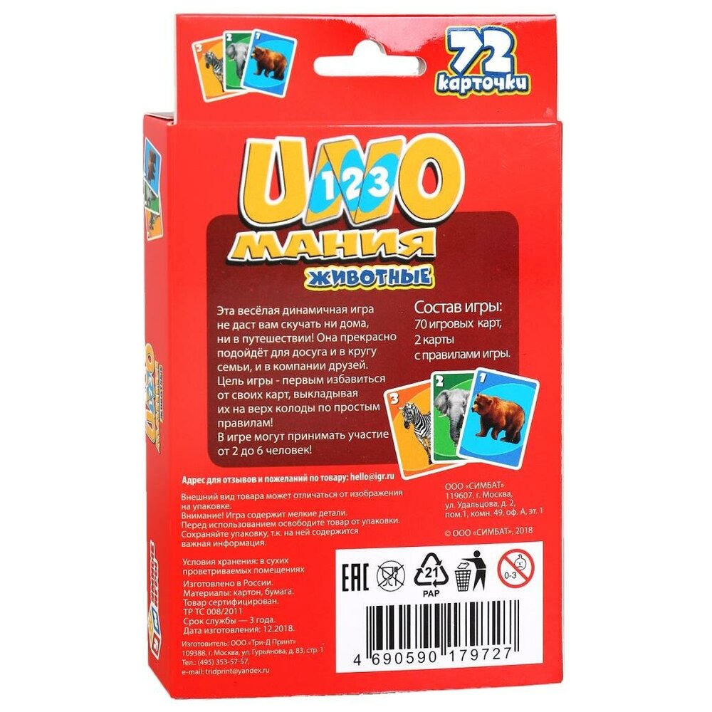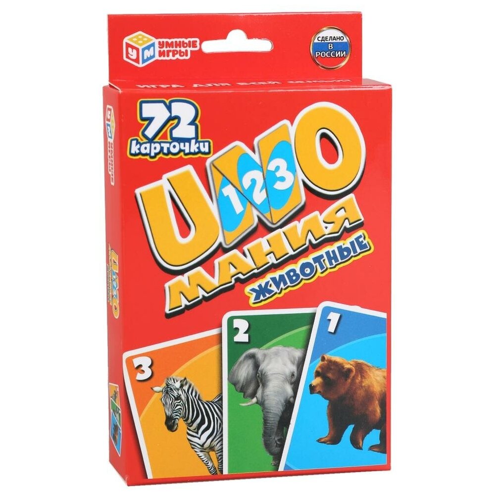 Весёлая динамичная карточная игра «УНОмания. Животные» торговой марки «Умные игры» не даст заскучать ни дома, ни в путешествии! Она прекрасно подойдёт для досуга в кругу семьи и в компании друзей. Цель игры первым избавиться от своих карт, выкладывая из на верх колоды по простым правилам. Состав игры 72 карты: - 70 карт; - 2 карты с правилами игры. В игре могут принимать участие от 2 до 6 человек! Дети не только весело проведут время, но и познакомятся с многообразным миром животных! Карточная игра «УНОмания. Животные» ТМ «Умные игры» отличный повод собраться с друзьями или в кругу семьи и увлекательно провести время. .Размер: 2 x 16 x 9 см. Материал картон. Рекомендовано детям от 3 лет.