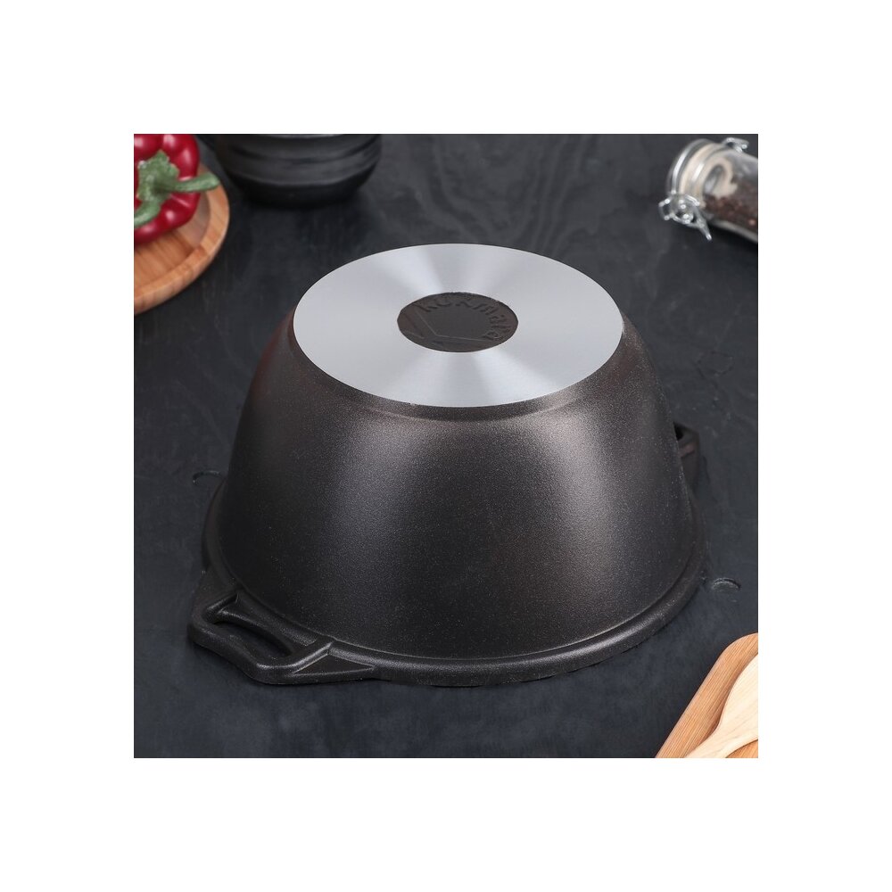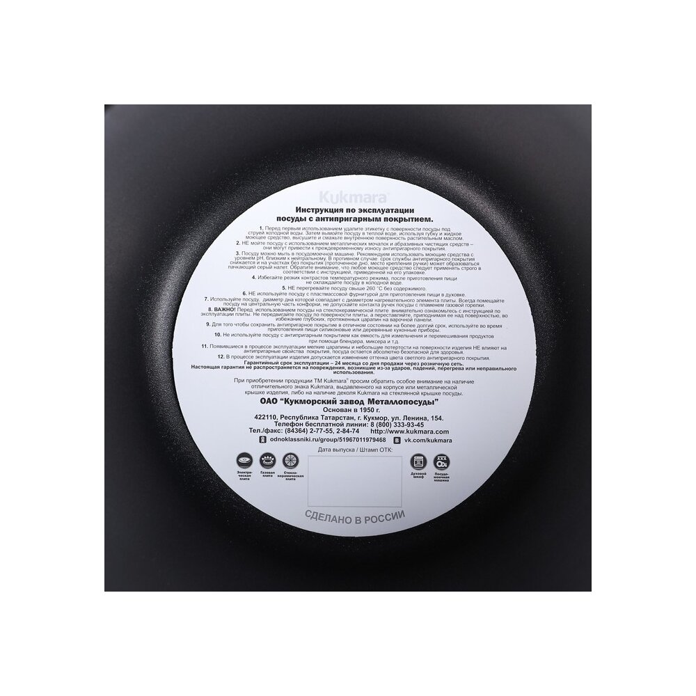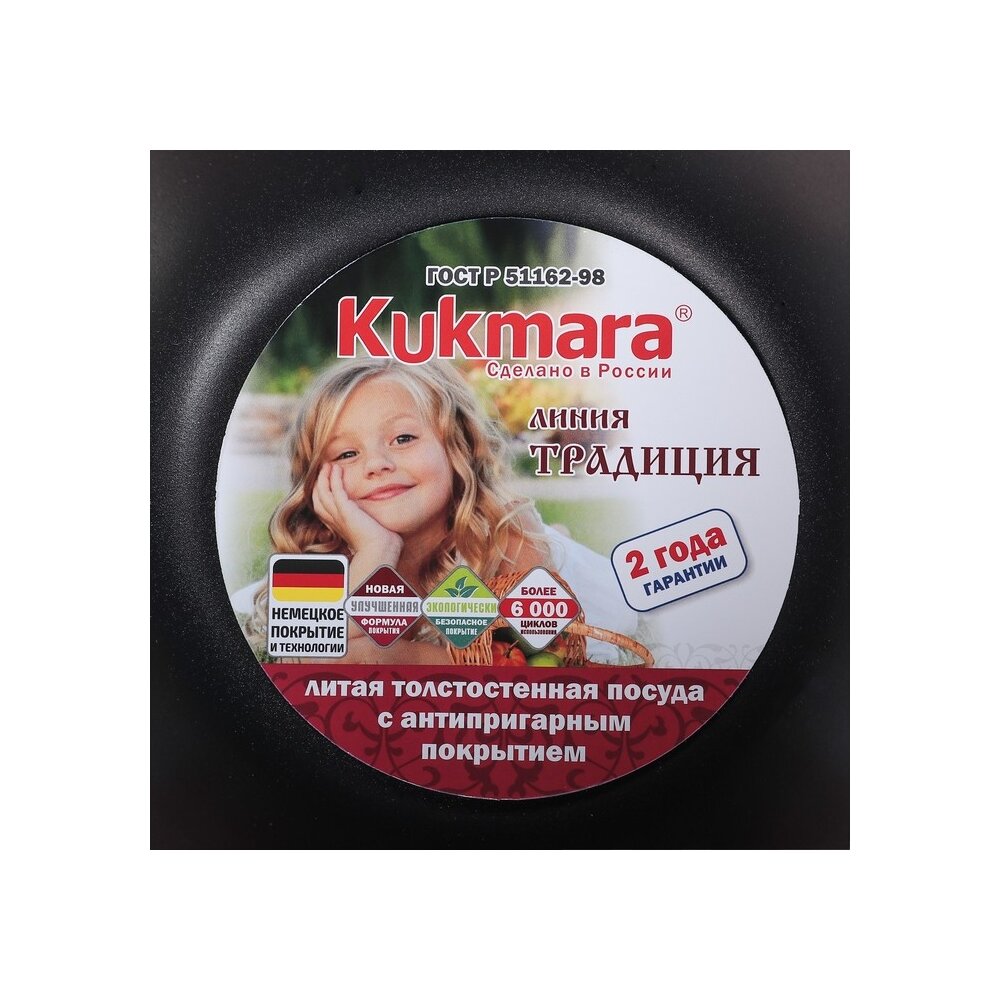 Продукция Kukmara изготовлена из литого алюминия и покрыта немецким высококачественным антипригарным покрытием на водной основе, усиленным сверхпрочными минеральными частицами. Значительная толщина стенок и дна исключает деформацию корпуса посуды, гарантирует её долговечность, обеспечивает необходимую прочность покрытия. Высокопрочное антипригарное покрытие на водной основе, усиленное сверхпрочными минеральными частицами. Экологически безопасное антипригарное покрытие без содержания PFOA (перфторированная карбоновая кислота). Идеальное распределение тепла по всей поверхности посуды, длительное сохранение тепла. Возможность использования минимального количества жира. Антипригарное покрытие наносится методом напыления, который гарантирует исключительную стойкость покрытия при эксплуатации. Мелкие царапины и небольшие потёртости на поверхности посуды не влияют на свойства.