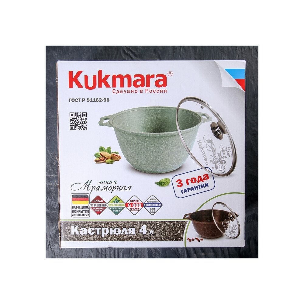 Кастрюля Kukmara сделана из литого алюминия. Имеет инновационное антипригарное мраморное покрытие на водной основе и усилено сверхтвёрдыми частицами минералов. Значительная толщина стенок и дна исключает деформацию корпуса кастрюли, гарантирует её долговечность, обеспечивает необходимую прочность. Высокопрочное антипригарное мраморное покрытие на водной основе, усиленное сверхтвёрдыми частицами минералов. Экологически безопасное покрытие без содержания PFOA (перфтороктановая кислота). Идеальное распределение тепла по всей поверхности посуды, длительное сохранение тепла. Возможность использования минимального количества жира. Антипригарное мраморное покрытие наносится методом напыления, который гарантирует исключительную стойкость при эксплуатации.