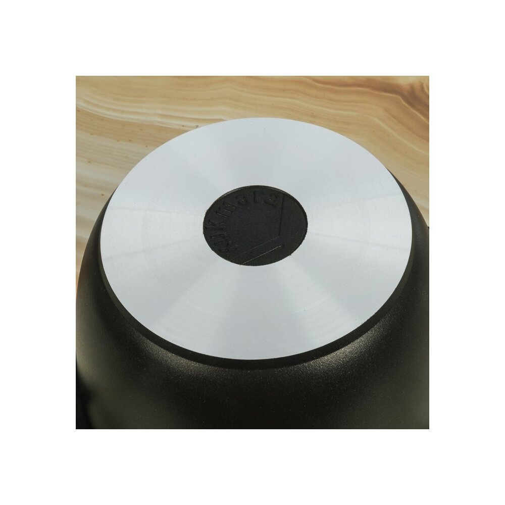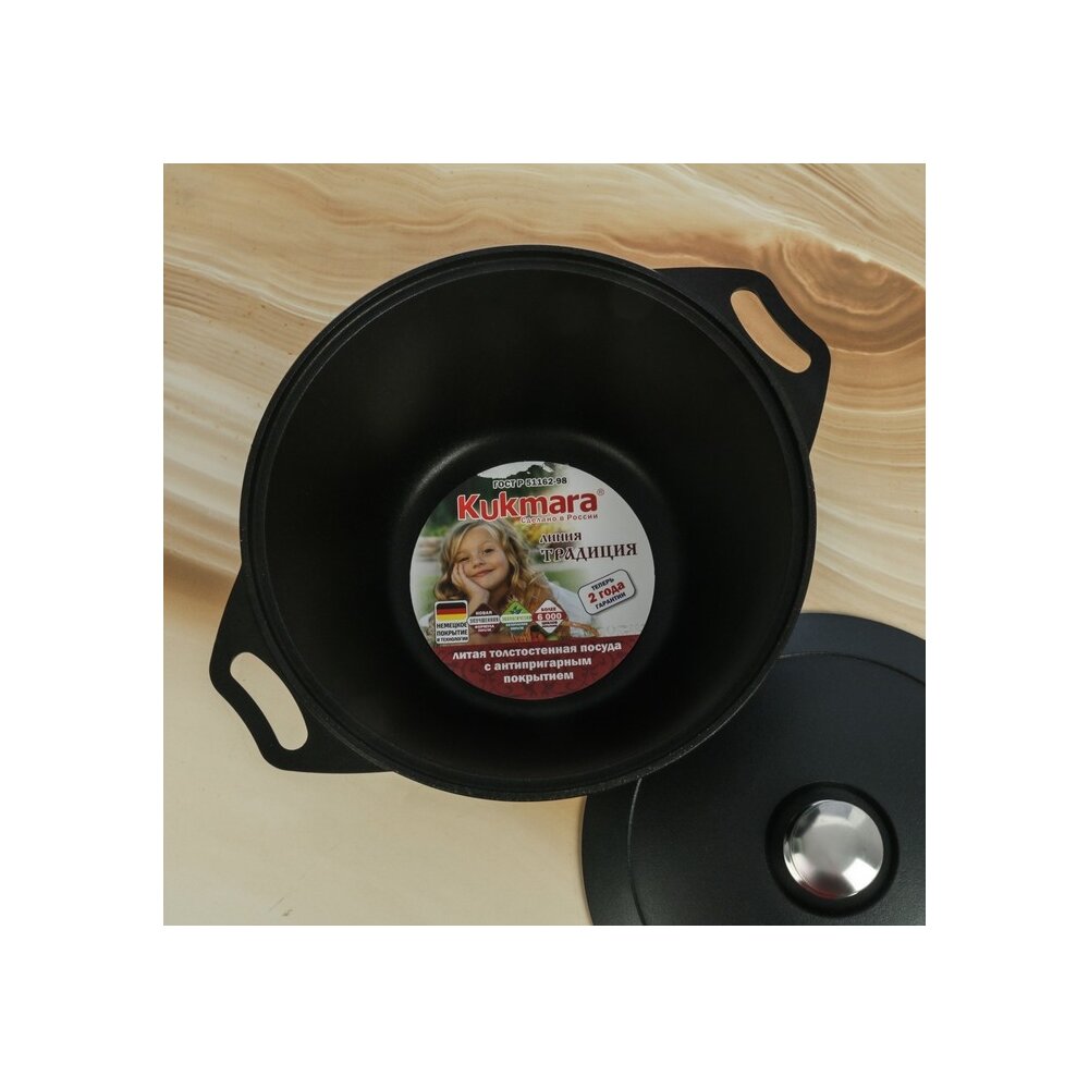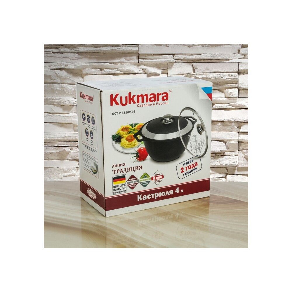 Продукция Kukmara изготовлена из литого алюминия и покрыта немецким высококачественным антипригарным покрытием на водной основе, усиленным сверхпрочными минеральными частицами. Значительная толщина стенок и дна исключает деформацию корпуса посуды, гарантирует её долговечность, обеспечивает необходимую прочность покрытия. Высокопрочное антипригарное покрытие на водной основе, усиленное сверхпрочными минеральными частицами. Экологически безопасное антипригарное покрытие без содержания PFOA (перфторированная карбоновая кислота). Идеальное распределение тепла по всей поверхности посуды, длительное сохранение тепла. Возможность использования минимального количества жира. Антипригарное покрытие наносится методом напыления, который гарантирует исключительную стойкость покрытия при эксплуатации. Мелкие царапины и небольшие потёртости на поверхности посуды не влияют на свойства.