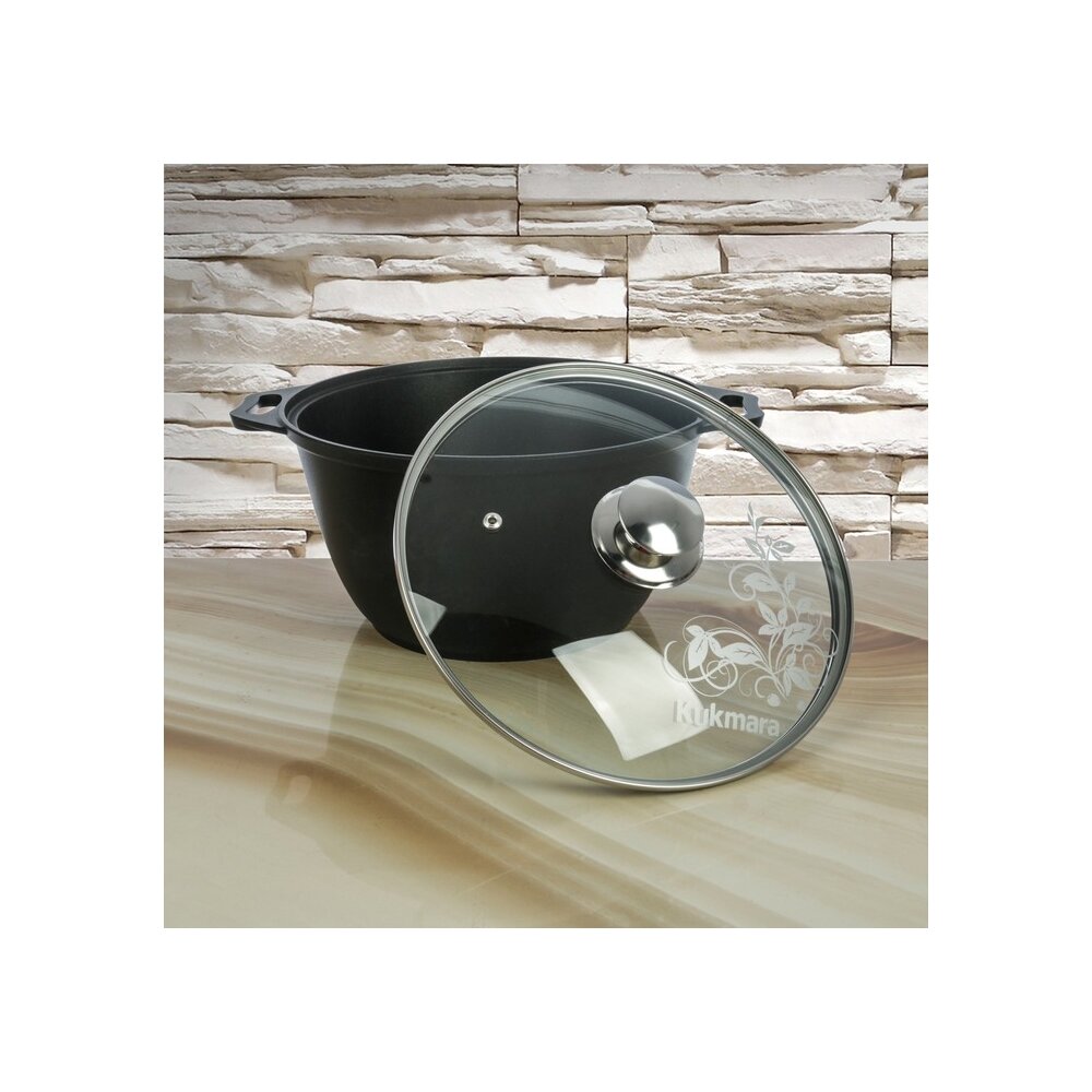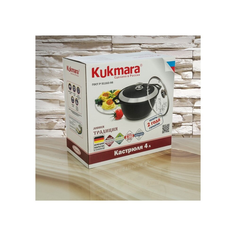 Продукция Kukmara изготовлена из литого алюминия и покрыта немецким высококачественным антипригарным покрытием на водной основе, усиленным сверхпрочными минеральными частицами. Значительная толщина стенок и дна исключает деформацию корпуса посуды, гарантирует её долговечность, обеспечивает необходимую прочность покрытия. Высокопрочное антипригарное покрытие на водной основе, усиленное сверхпрочными минеральными частицами. Экологически безопасное антипригарное покрытие без содержания PFOA (перфторированная карбоновая кислота). Идеальное распределение тепла по всей поверхности посуды, длительное сохранение тепла. Возможность использования минимального количества жира. Антипригарное покрытие наносится методом напыления, который гарантирует исключительную стойкость покрытия при эксплуатации. Мелкие царапины и небольшие потёртости на поверхности посуды не влияют на свойства.