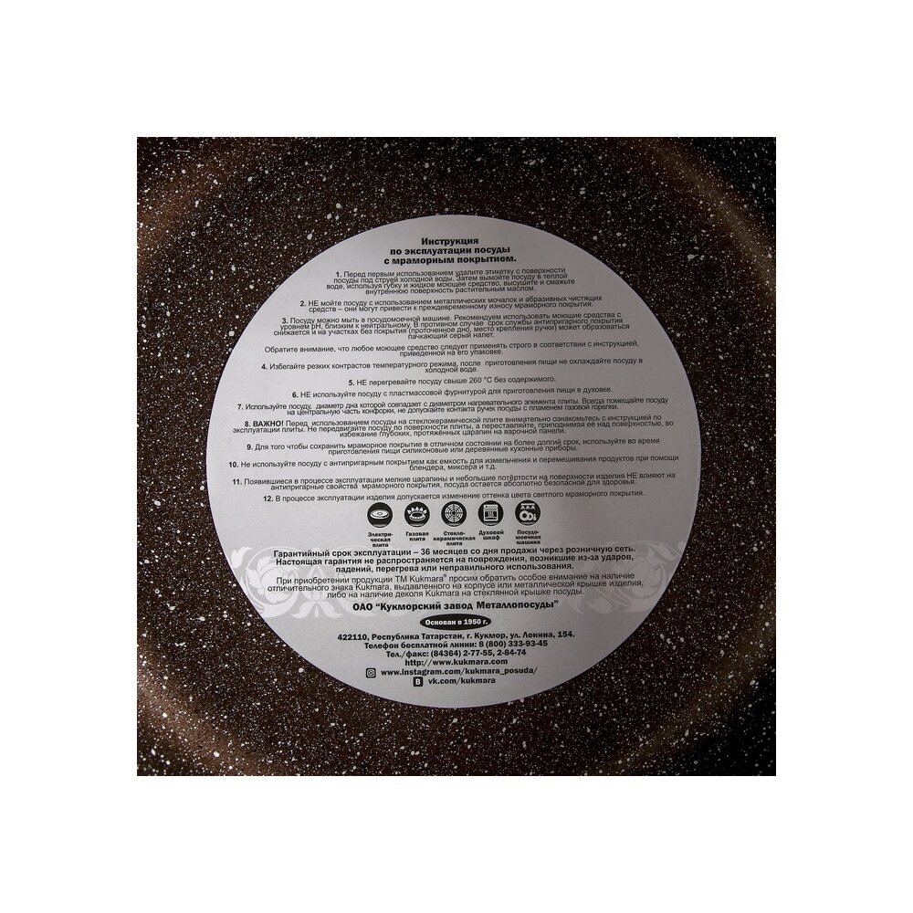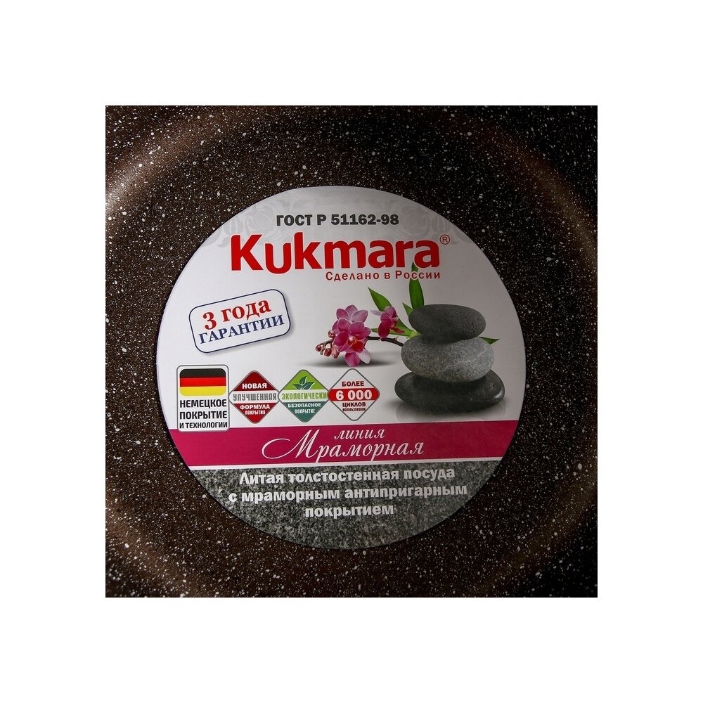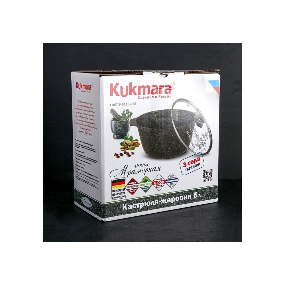Кастрюля-жаровня Kukmara сделана из литого алюминия. Имеет инновационное антипригарное мраморное покрытие на водной основе и усилено сверхтвёрдыми частицами минералов. Значительная толщина стенок и дна исключает деформацию корпуса кастрюли, гарантирует её долговечность, обеспечивает необходимую прочность. Высокопрочное антипригарное мраморное покрытие на водной основе, усиленное сверхтвёрдыми частицами минералов. Экологически безопасное покрытие без содержания PFOA (перфтороктановая кислота). Идеальное распределение тепла по всей поверхности посуды, длительное сохранение тепла. Возможность использования минимального количества жира. Антипригарное мраморное покрытие наносится методом напыления, который гарантирует исключительную стойкость при эксплуатации.