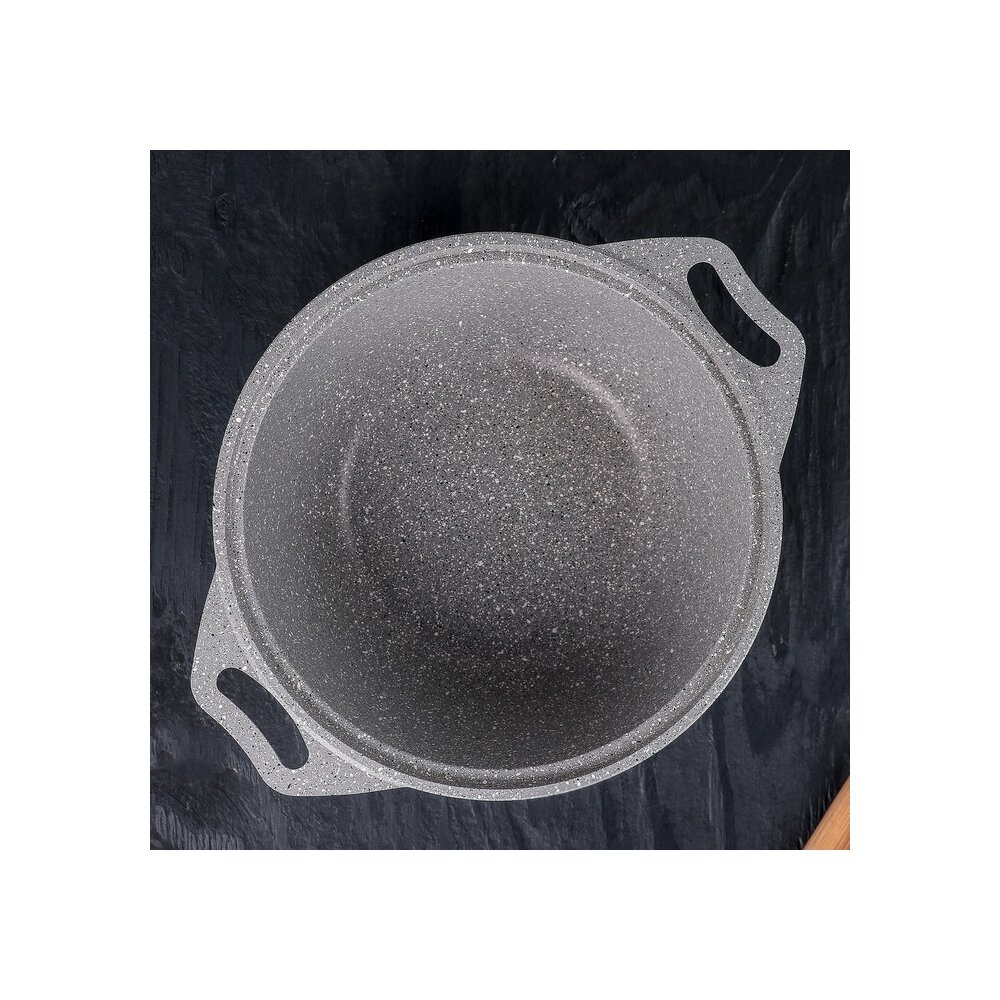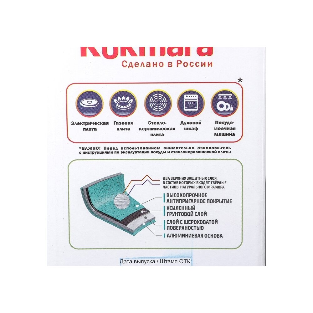 Кастрюля Kukmara сделана из литого алюминия. Имеет инновационное антипригарное мраморное покрытие на водной основе и усилено сверхтвёрдыми частицами минералов. Значительная толщина стенок и дна исключает деформацию корпуса кастрюли, гарантирует её долговечность, обеспечивает необходимую прочность. Высокопрочное антипригарное мраморное покрытие на водной основе, усиленное сверхтвёрдыми частицами минералов. Экологически безопасное покрытие без содержания PFOA (перфтороктановая кислота). Идеальное распределение тепла по всей поверхности посуды, длительное сохранение тепла. Возможность использования минимального количества жира. Антипригарное мраморное покрытие наносится методом напыления, который гарантирует исключительную стойкость при эксплуатации.