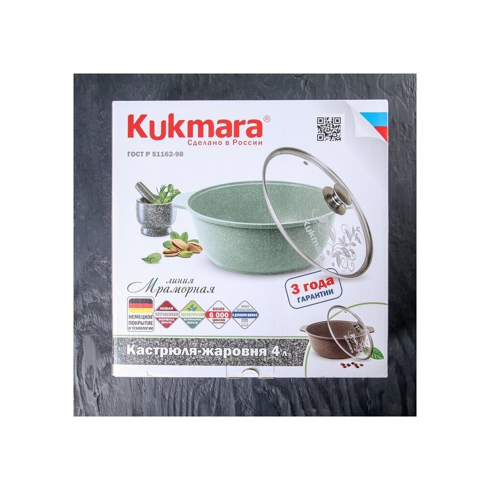 Кастрюля-жаровня Kukmara сделана из литого алюминия. Имеет инновационное антипригарное мраморное покрытие на водной основе и усилено сверхтвёрдыми частицами минералов. Значительная толщина стенок и дна исключает деформацию корпуса кастрюли, гарантирует её долговечность, обеспечивает необходимую прочность. Высокопрочное антипригарное мраморное покрытие на водной основе, усиленное сверхтвёрдыми частицами минералов. Экологически безопасное покрытие без содержания PFOA (перфтороктановая кислота). Идеальное распределение тепла по всей поверхности посуды, длительное сохранение тепла. Возможность использования минимального количества жира. Антипригарное мраморное покрытие наносится методом напыления, который гарантирует исключительную стойкость при эксплуатации.