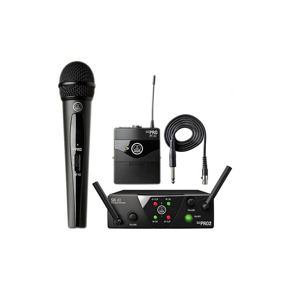 Артикул № 764047 AKG WMS40 Mini2 Mix Set US25AC – это комплект беспроводной радиосистемы, включающий в себя двухканальный приемник SR40 Mini Dual, поясной передатчик PT40, ручной передатчик HT40 с микрофонным капсюлем D88 и инструментальный кабель MKG L. Данный набор предназначен для одновременной работы с музыкальным инструментом, например, электрогитарой, и радиомикрофоном, причем благодаря входному разъему mini-XLR у трансмиттера PT40 подключать можно и другие микрофоны различного типа, которые приобретаются отдельно. Трансляция сигнала осуществляется на двух фиксированных радиочастотах: 537.500 МГц (US25A) и 537.300 МГц (US25C). Одна частота отвечает за один канал. Зона действия в пространстве при идеальных условиях способна достигать 20-30 метров.. Ресивер SR40 выполнен в компактном стальном корпусе, который надежно защищает внутренние компоненты и удобен при транспортировке. Для высокоточного приема сигнала присутствуют две антенны, а подключение к акустической системе происходит с помощью двух балансных выходов на разъемах 1/4" Jack TRS. На лицевой части располагаются индикаторы статуса и наличия перегрузки, а также есть регуляторы громкости для каждого канала. Озвучиваемый частотный диапазон простирается от 40 Гц до 20 кГц, что соответствует всему спектру полезных частот гитар и голоса. Энергообеспечение происходит от адаптера питания.