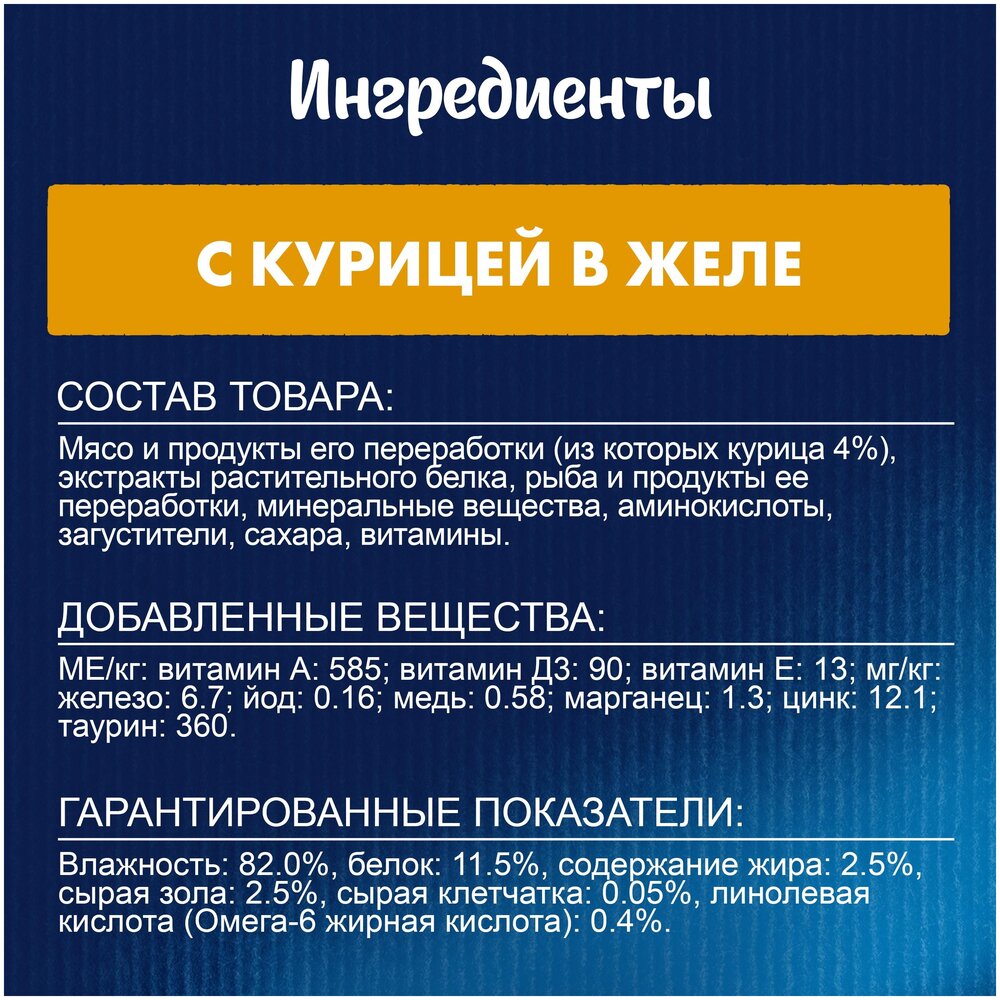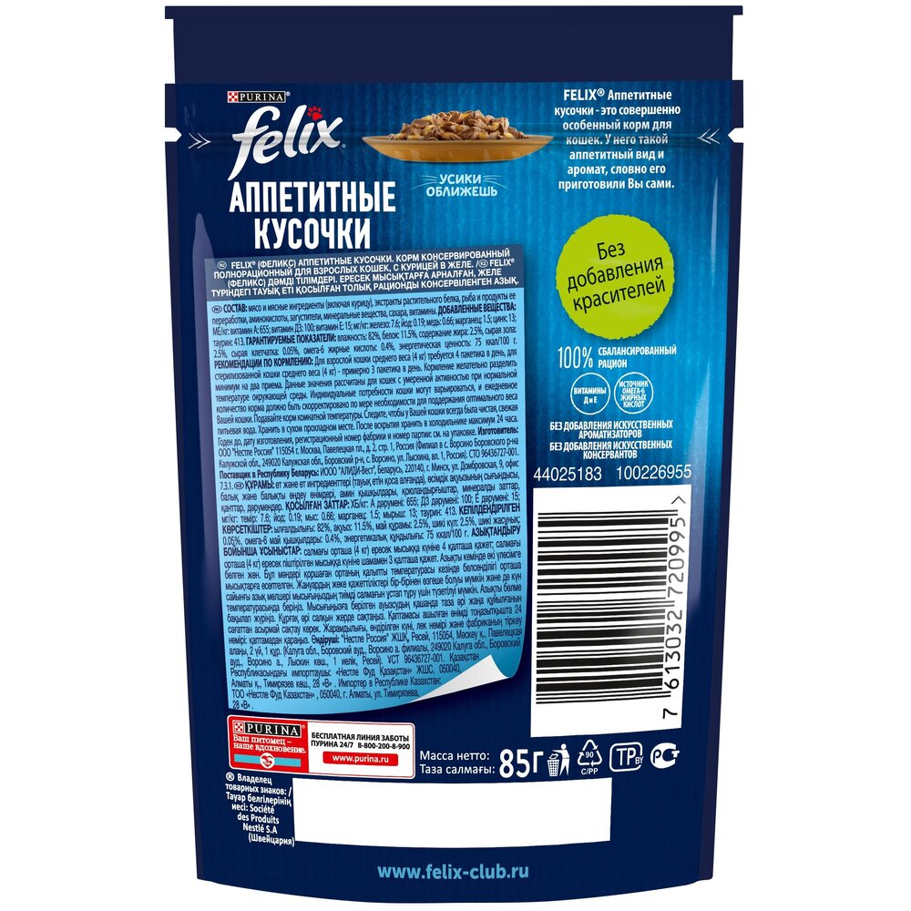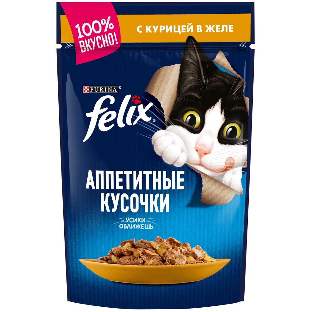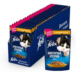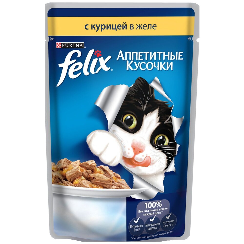 Феликс® Аппетитные кусочки — это совершенно особенный корм. У него такой аппетитный вид и аромат, словно Вы приготовили его сами. Каждый пакетик содержит нежные кусочки в сочном желе — вкуснятину, от которой кота за уши не оттащишь. Они такие же аппетитные на вкус, как и на вид! Корм является источником необходимых Омега-6 жирных кислот с правильным сочетанием минеральных веществ и витаминов, чтобы полностью удовлетворить ежедневные потребности Вашей кошки.