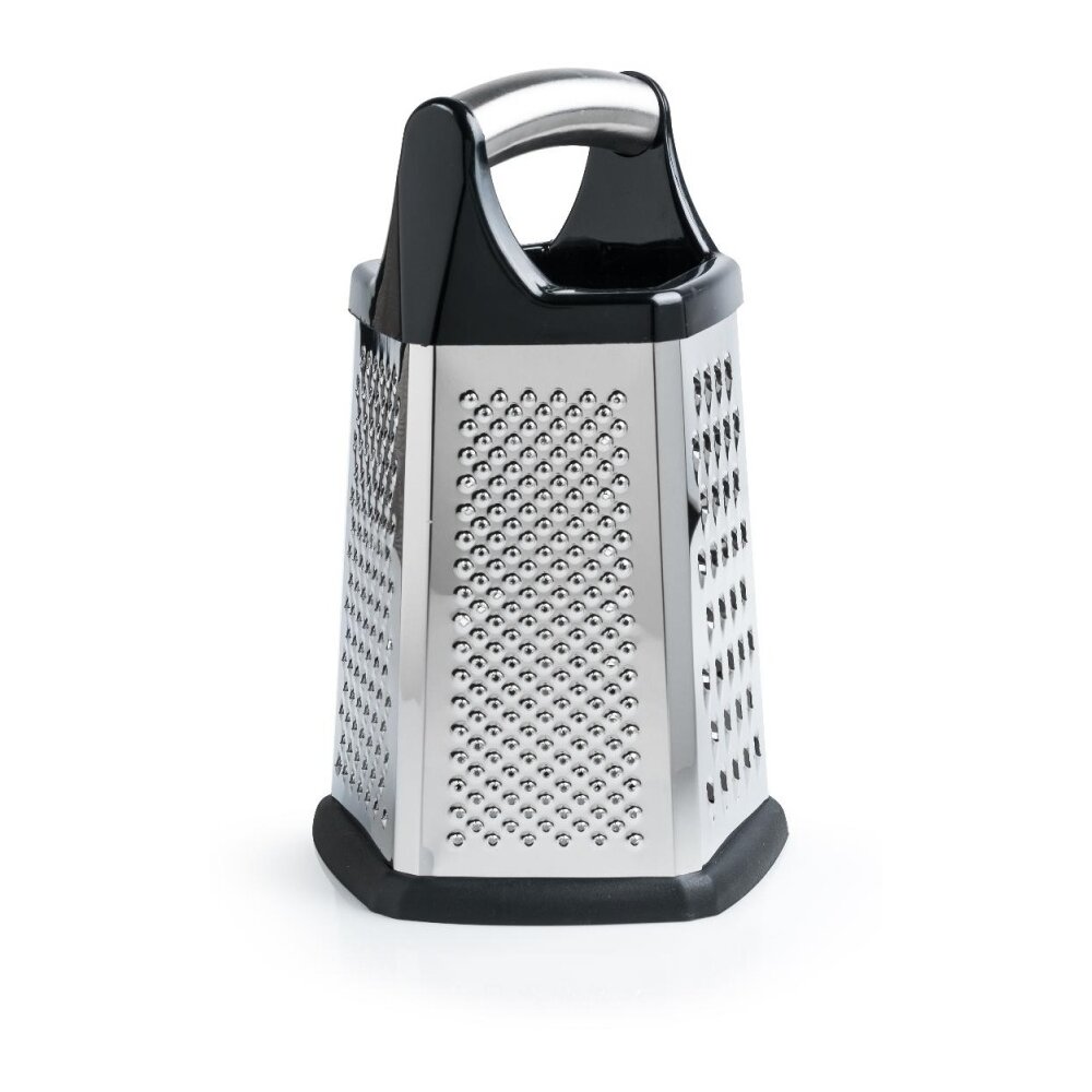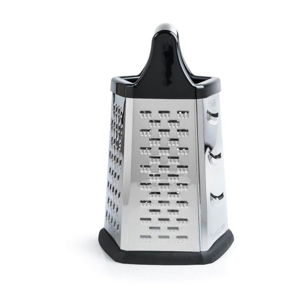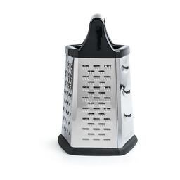 Количество предметов, шт. – 1 Количество лезвий – 5: крупная терка, средняя терка, мелкая терка, шинковка, шредер Материал корпуса – нержавеющая сталь Полировка – зеркальная Высота – 21,5 см Основание – 13 x 13 см Толщина стенок – 0,3 мм