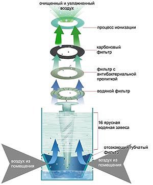 Очиститель воздуха; функции: ионизация, увлажнение, очистка; расход воды 400 мл/час; для помещений до 60 м2; фильтры: угольный; шум 29 дБ.