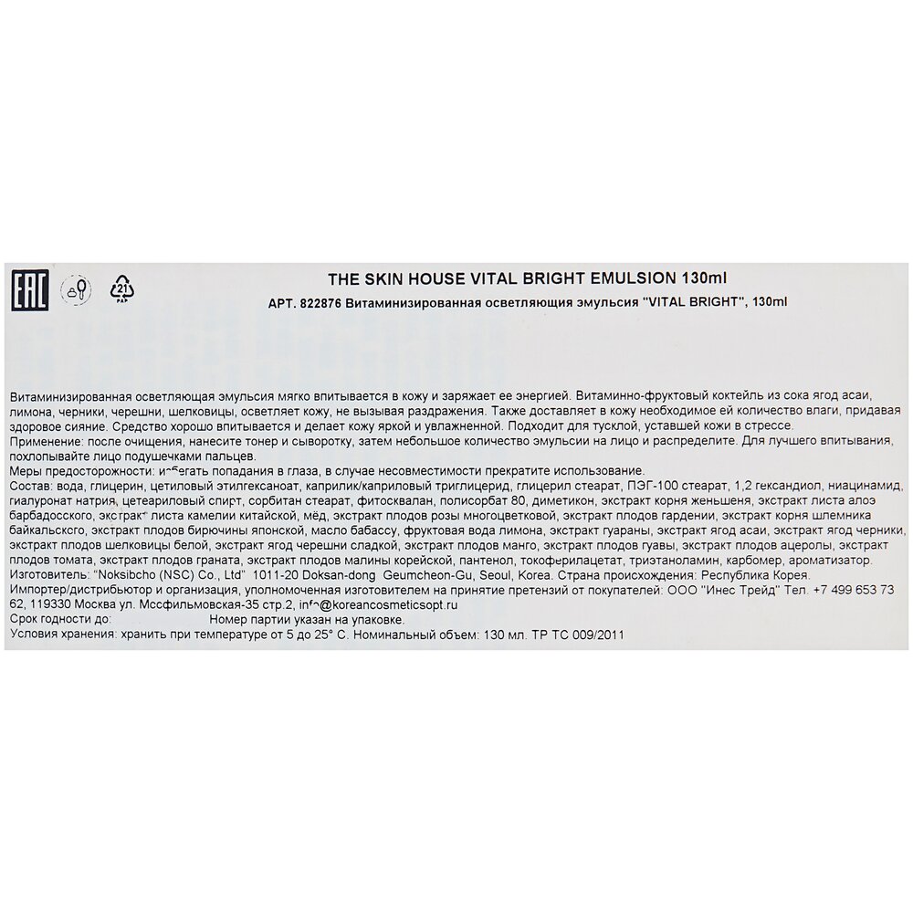 The Skin House Vital Bright Emulsion Витаминизированная осветляющая эмульсия для лица, 130 мл