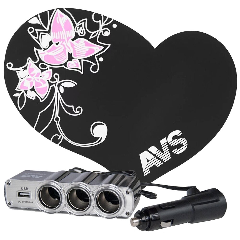 Разветвитель прикуривателя 12/24V AVS CS314U + Противоскользящий коврик "Сердце" NANO NP-005 - 43267/A80905S Комплект