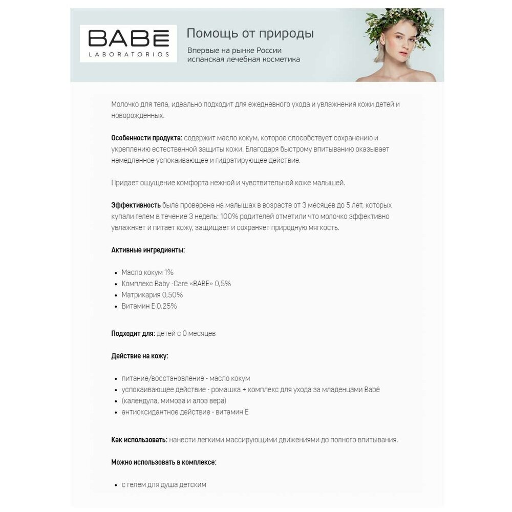 Детское молочко для тела Babe Laboratorios идеально подходит для ежедневного ухода и увлажнения кожи детей и новорожденных. Благодаря легкой текстуре быстро впитывается. Содержит масло гарцинии индийской, которое поддерживает и укрепляет естественную защитную функцию кожи.<p>Особенности продукта: молочко содержит комплекс Baby-Care BABE, дарит ощущение хорошего самочувствия и комфорта нежной и чувствительной коже малышей.</p><p>Подходит для: детей с 0 месяцев, для массажа после купания.</p>