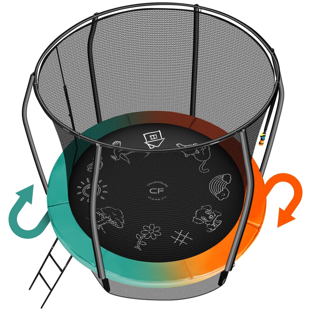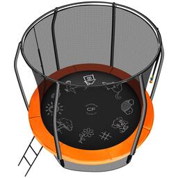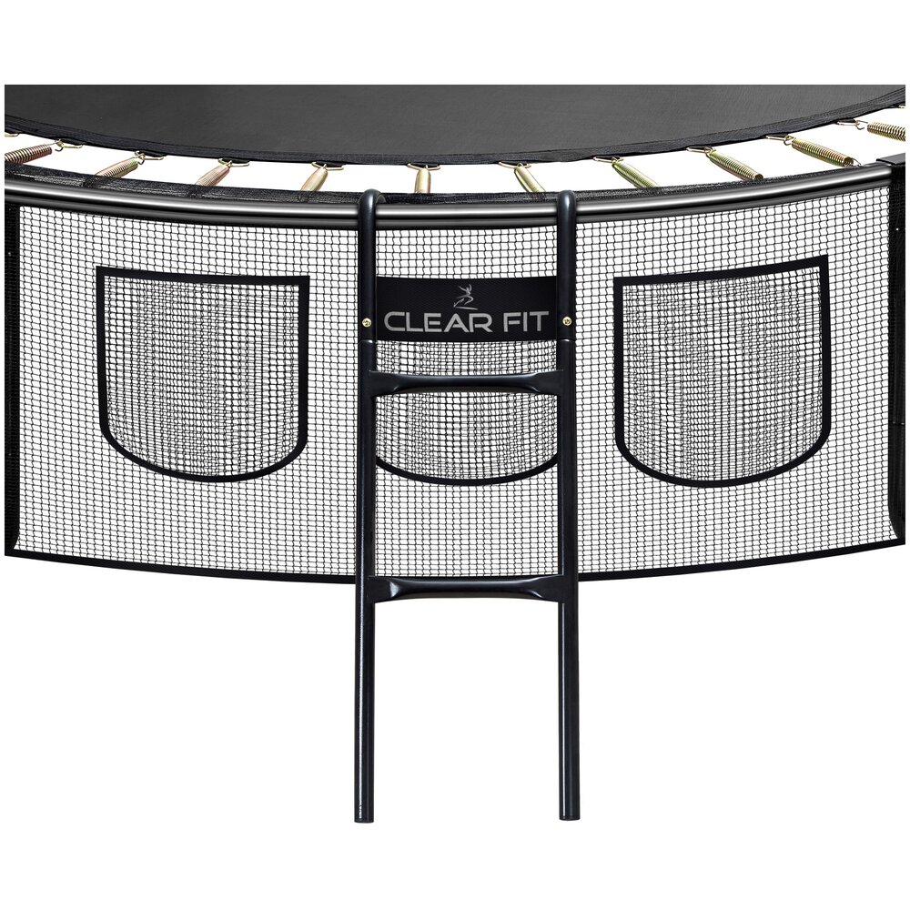 Батут Clear Fit серии FamilyHop — современная концепция семейного батута, объединившая все достоинства предыдущих поколений и учитывающая пожелания пользователей. Основной акцент серии на безопасность, надежность и развлечения для любого возраста. Мощный каркас из толстостенных труб, проверенные метизы, качественные пластик и материалы защиты, износостойкое прыжковое полотно и удобное крепление обеспечивают комфорт и безопасность для каждого члена семьи. Каркасное крепление защитной сети – удобное и надежное, прямое крепление к прыжковому полотну и дополнительная защита входа. Защитный мат – двусторонний, Вы можете выбрать цвет батута при установке и менять его по настроению – ярко оранжевый или изумрудный. В комплект входит спринклер, устанавливается по периметру батута, в жаркий день можно подключить подачу воды и наслаждаться прохладными брызгами. Для малышей на полотно нанесены рисунки - можно раскрашивать цветными мелками. Дополнительно к батутам размеров 10, 12 и 14 футов можно приобрести сет для баскетбола. Батуты FamilyHop поставляются в максимальной комплектации: батут, верхняя защитная сеть, цокольная защитная сеть, лестница, спринклер. Диаметр прыжковой поверхности 3.8 м идеально подходит для пользователей любого возраста, размеры полотна позволяют комфортно тренироваться взрослым и развлекаться детям, включая подростков. Верхняя защитная сеть оберегает от падений, нижняя защитная сеть исключает случайное попадание под батут во время тренировки. Качественные материалы и мощная рама предусматривают эксплуатацию батута 14FT с нагрузкой до 200 кг.<br />Каркасное крепление защитной сети – напрямую к прыжковому полотну, не только более надежно, но и создает аккуратный общий вид батута, без провисания сети, экономит время сборки и увеличивает рабочее пространство. Тренировки на батуте — это отличная аэробная нагрузка: улучшения общей физической формы, заряд положительными эмоциями, улучшение работы кардиоваскулярной системы, развитие чувства равновесия и координации в пространстве для пользователей любого возраста. Занятия на свежем воздухе укрепляют иммунитет, снабжают организм кислородом, повышают выносливость как у детей, так и у взрослых. Именно поэтому мы используем только высококачественные комплектующие с большим запасом прочности. В большинстве случаев батуты данного типа устанавливаются под открытым небом, обязательные требования к материалам — это влагостойкость, термоустойчивость, в том числе и к низким температурам, переносимость ультрафиолетовых лучей и износостойкость.<br />Конструкция для обеспечения безопасности выполнена из нержавеющей стали Q195, диаметр стальных труб W - опор и каркаса 42 мм. Каркас из труб толщиной 1.6 мм соединяется с помощью мощных сварных Т-образных кронштейнов из металла толщиной 2.05 мм и высококачественных гальванизированных метизов. Порошковая окраска основных элементов и двойная оцинковка всех труб конструкции исключает коррозию, увеличивает срок эксплуатации тренажера.<br />Прыжковое полотно — это основной элемент батута. Материал прыжкового полотна Перматрон (Permatron) — эластичный материал, способный возвращаться в исходное состояние при постоянном воздействии с разным усилием. Термообработка волокон материала обеспечивает высокую прочность на разрыв и стрессоуст