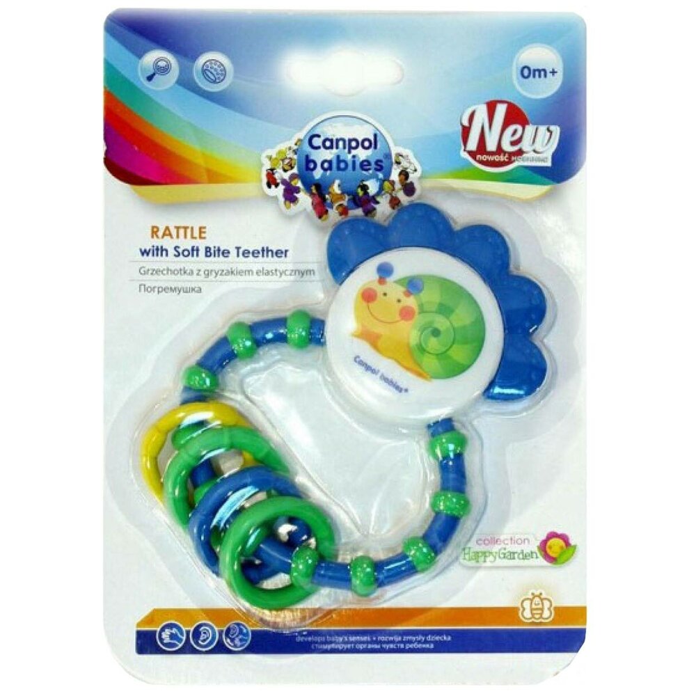 Погремушка-прорезыватель Canpol Happy garden имеет рельефную поверхность, которая массирует дёсны малыша, помогая облегчить боль, поэтому идеально подойдёт в период прорезывания зубов. Забавные звуки погремушки и подвесные колечки позабавят и отвлекут кроху.<p>Благодаря удобной форме погремушку легко захватить маленькими ручками. Игрушка не имеет острых краёв. Погремушка способствует развитию цветового восприятия, слуха и мелкой моторики крохи. Изготовлена из безопасных и прочных материалов, не вызывает аллергии. Подходит для детей с рождения.</p>