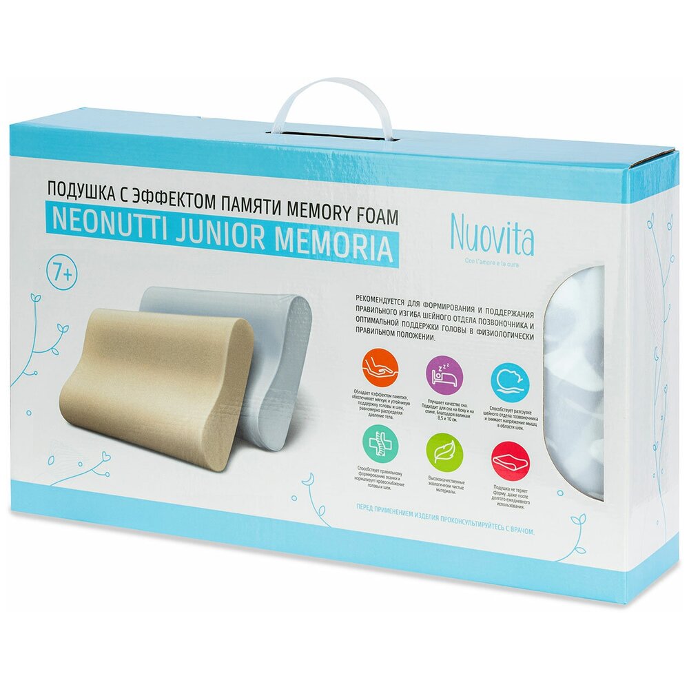 Детская подушка Nuovita из плотной термочувствительной пены Neonutti Junior Memoria подходит всем малышам старше 7-х лет и предназначена для создания комфортных условий во время сна. Она обеспечивает нежную поддержку шейного отдела позвоночника, способствует правильному формированию его изгиба и эффективно снимает напряжение мышц в области шеи.<br /> Подушка имеет размеры 50х30 см, высота валика с одной стороны составляет 8,5 см, с другой — 10 см. Изделие создает правильную поддержку для шеи и головы вне зависимости от того, на спине или на боку спит ребенок. Мягкий и устойчивый наполнитель с «эффектом памяти» мгновенно подстраивается под особенности шейного отдела и головы ребенка, и не оказывает ответного давления. При изменении положения тела пена Memory Foam в течение нескольких секунд возвращается в исходное положение либо адаптируется к вновь предложенной форме.<br /> Пена с открытыми порами имеет отличную воздухопроницаемость и не поддерживает размножение бактерий и пылевых клещей. Чехол является съемным, он изготовлен из 100% хлопка, поэтому не электризуется, хорошо впитывает влагу и пропускает воздух. Детская подушка Neonutti Junior Memoria изготовлена из высококачественных экологически чистых материалов и рассчитана на длительное использование.