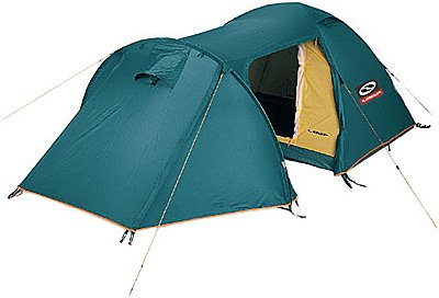 Палатка кемпинговая; количество мест 4; количество входов 3; форма палатки полусфера; количество дуг 4; материал каркаса стеклопластик; водостойкость тента 2000 мм вод; ст; вентиляционные клапаны, антимоскитные сетки; вес комплекта 5,35 кг; высота 130 см.