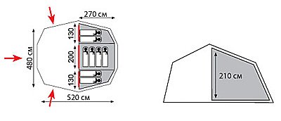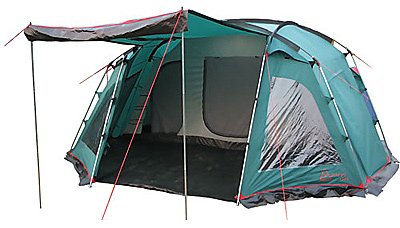 Палатка кемпинговая; количество мест 8; количество входов 3; форма палатки полусфера; материал каркаса стеклопластик; водостойкость тента 4000 мм вод; ст; ветрозащитная юбка, вентиляционные клапаны, антимоскитные сетки, проклеенные швы, искрозащитная обработка; вес комплекта 24 кг; высота 210 см.
