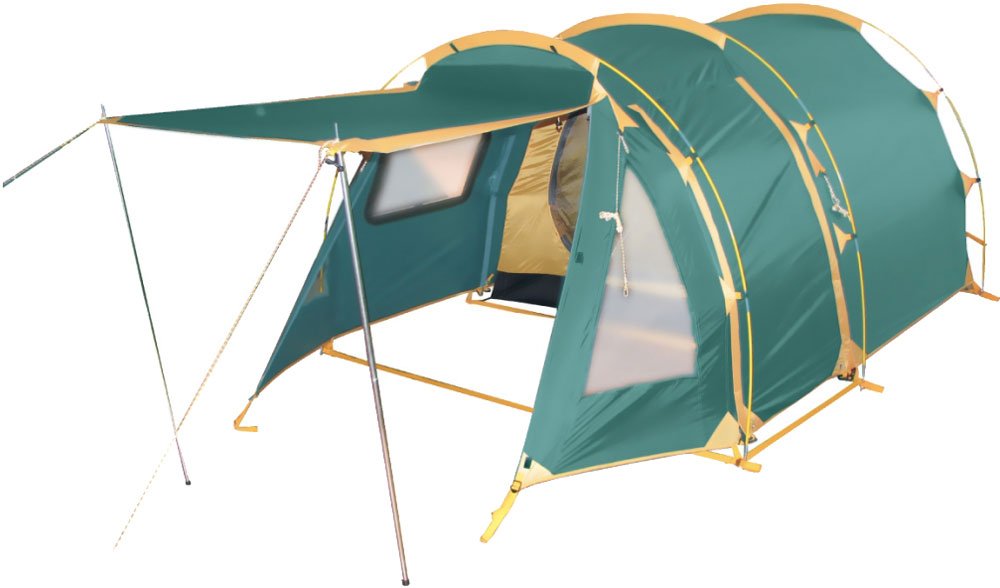Палатка треккинговая; количество мест 2; количество входов 2; форма палатки полубочка; материал каркаса стеклопластик; водостойкость тента 5000 мм вод; ст; вентиляционные клапаны, антимоскитные сетки, проклеенные швы, искрозащитная обработка; вес комплекта 5,4 кг; высота 120 см.