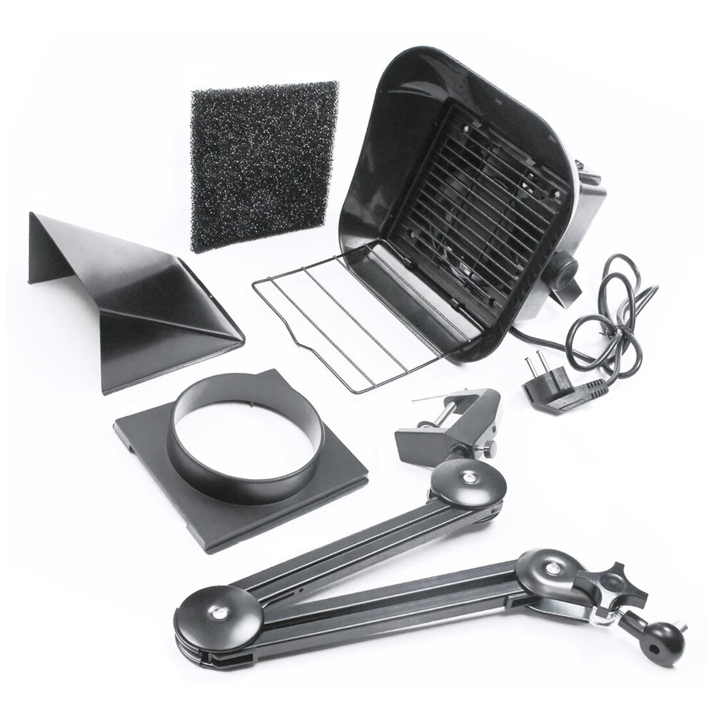 Мегеон 02813 – это настольный дымоуловитель со сменным фильтрующим элементом. Дымоуловитель устанавливается на штатив, благодаря этому он не занимает место на рабочем столе, а штативная установка коленчатого типа позволяет без труда установить в необходимое место и точно настроить его положение. Благодаря встроенному вентилятору большой производительности дымоудаление получило высокую эффективность. Все продукты вредные сгорания пройдя через угольный фильтр абсорбируются в нём и на выходе имеют меньшую активность и становятся безопаснее. В комплекте поставки имеется специальные переходники для подключения оборудования к централизованной системе вентиляции. Сам фильтрующий элемент способен задержать в себе до 2 грамм вредных веществ, выделяемых в процессе пайки. Не экономьте на себе, берегите своё здоровье. Особенности: -Штативная система крепления -Два запасных фильтрующих элемента -Переходник для вентиляционного рукава -Высокая эффективность -Низкий уровень шума Комплект поставки: 1. Дымоуловитель мегеон 02813 – 1 шт. 2. Штатив – 1 шт. 3. Струбцина – 1 шт. 4. Сменные фильтрующие элементы – 3 шт. (один установлен) 5. Переходники – 2 шт. 6. Руководство по эксплуатации – 1 шт. 7. Гарантийный талон – 1 шт. Технические характеристики: -Напряжение питания ~ 230 В 50 Гц -Потребляемая мощность 40 Вт -Максимальная абсорбация фильтрующим элементом ≈ 2 г -Масса активированного угля 7 г -Производительность ≤ 1 м³/мин -Условия эксплуатации Температура: 10…30°С Относительная влажность: не более 85% -Условия транспортировки и хранения Температура: -30…60°С Относительная влажность: не более 85% без выпадения конденсата -Размеры прибора 210х140х210 мм -Длина стойки 500 мм -Размеры упаковки 225х170х335 мм