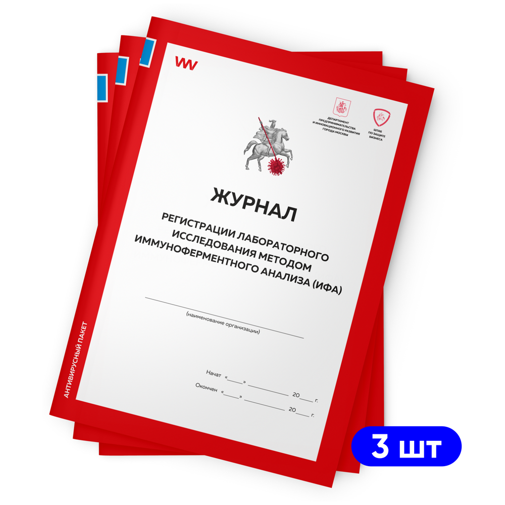 Комплект журналов регистрации лабораторного исследования методом иммуноферментного анализа (ИФА), 3 шт. по 56 стр., форма из антивирусного пакета Департамента предпринимательства и инновационного развития города Москвы, Докс Принт