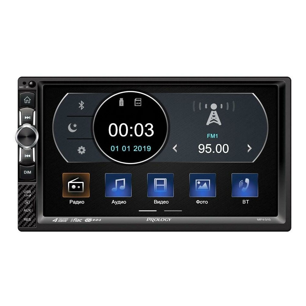Автомобильный мультимедийный центр PROLOGY MPV-310 монтажного размера 2DIN обеспечивает прием радиостанций в диапазоне FM, воспроизведение медиафайлов, записанных на карты памяти USB / microSD, передачу звука с внешних источников, а также управление мобильным телефоном через интерфейс Bluetooth (version 4.2). Поддерживается подключение штатных кнопок управления аудиосистемой на руле (интерфейс SWC). Особенности модели PROLOGY MPV-310. Широкоформатный сенсорный экран с диагональю 7" (176 мм), повышенной контрастности, с антибликовым покрытием; Матрица экрана с высоким разрешением — 800 х 480 пикселей; Цифровой радиотюнер с диапазоном частот FM; Максимальная выходная мощность 4 х 55 Вт, поддержка акустики на 4 и 8 Ом; Поддержка Bluetooth® профилей: A2DP и AVRCP — Воспроизведение музыки; HSP, HFP — hands-free и синхронизация с адресной книгой телефона. Bluetooth (version 4.2); Поддержка карт памяти microSDXC объёмом до 256 ГБ и USB флеш-накопителей; Воспроизведение файлов MP3, MKV, MPEG4, WMA, JPEG и формата FLAC, который обеспечивает качество звучания аналогичное оригинальному CD-диску (Аудио-файлы FLAC-Free Lossless Audio Codec File — файлы аудио-формата, в котором используется сжатие без потери качества звучания); Фронтальный разъём USB со встроенной функцией подзарядки для мобильных устройств; Встроенный интерфейс для подключения к резистивным кнопкам управления, расположенным на руле; Поддержка камеры переднего вида и камеры заднего обзора, автопереключение; Пульт дистанционного управления; Многоцветная подсветка кнопок управления; Укороченный металлический корпус; Минимальная установочная глубина 80 mm. Комплект поставки PROLOGY MPV-310. Устройство PROLOGY MPV-310. Декоративная рамка. Пульт Дистанционного управления. Соединительные кабели. Краткое руководство пользователя. Технические характеристики PROLOGY MPV-110. Основные. Напряжение питания — 12 В постоянного тока. Предельные значения напряжения питания — 11–14,4 В. Номинал встроенного предохранителя — 15 А. Полярность источника питания — Только системы с заземлением отрицательного полюса батареи. Максимальная выходная мощность — 4x55 Вт. Потребляемая мощность — 100 Вт. Рекомендуемое сопротивление динамиков — 4–8 Ом. Установочные размеры устройства (ШxВxГ) — 178x100x80 мм. Диапазон рабочих температур — -10.. +60 °С. Температура хранения — -20..+70 °С. Допустимая влажность при работе — 45..80 %. Допустимая влажность при хранении — 30..90 %. Монитор. Тип дисплея — жидкокристаллический. Диагональ экрана — 7″ (176 мм). Разрешение экрана — 800 x 480 пикселей. Яркость — 450 кд/м2. FM-приемник. Диапазон частот — 87,5–108 МГц. Полезная чувствительность (отн. с/ш - 30 дБ) — 12 дБ (мкВ). Отношение сигнал-шум, не менее — 60 дБ. Искажения, не более — 1%. Диапазон воспроизводимых частот — 16–17000 Гц (-3 дБ). USB / microSD. Отношение сигнал-шум, не менее — 85 дБ. Искажения, не более — 1%. Диапазон воспроизводимых частот — 10–20000 Гц (-3 дБ). Модуль Bluetooth. Версия — versia 4.2. Максимальная дальност
