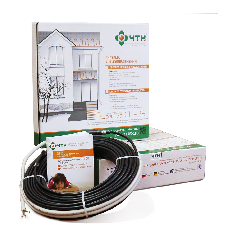 Греющие кабели марки СН-28 имеют определенную строительную длину. Изготовлены на основе резистивного двухжильного нагревательного кабеля с постоянной удельной мощностью тепловыделения 28 Вт/м. Кабель стоек к разрушающему воздействию ультрафиолетовых лучей. Применяются в системах обогрева открытых площадок, дорожек, пандусов, а также кровли, крыши, водостоков. Система «Обогрев открытых площадок» обеспечивает таяние снега, сток талой воды с поверхности обогрева и предотвращения тем самым образование наледи.
