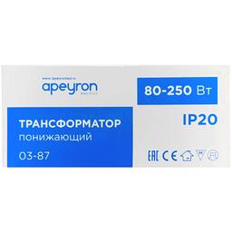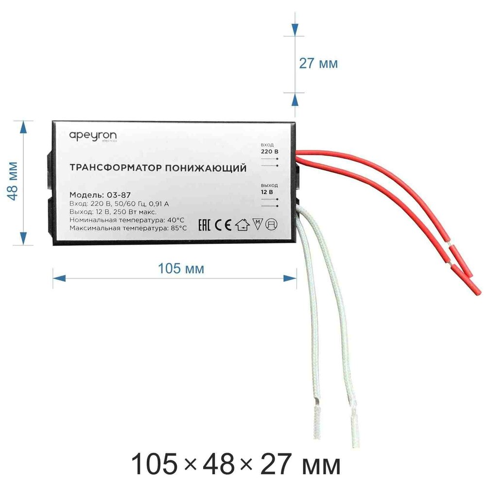 Трансформатор понижающий Apeyron 03-87 для подключения галогеновых ламп с рабочим напряжением 12В. Бесшумный блок питания для освещения с защитой от перегрузки, перегрева и замыкания. 12В, 80-250Вт, 105х48х27 мм, металл, черный