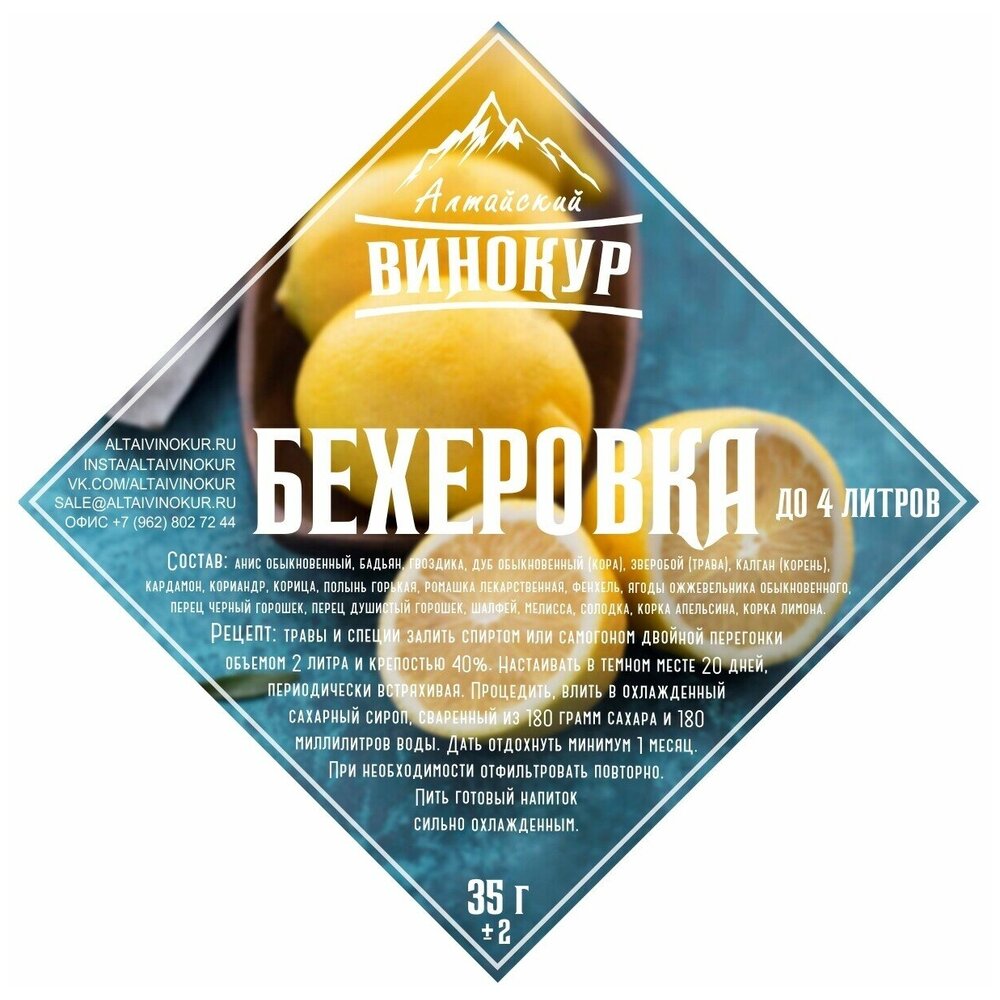 Известный Чешский ликер в нашем уникальном исполнении. В составе 20 трав и специй только высшей категории качества. Бехеровка, бехеровка, бехеровочка - как не назови - любимейший набор большинства клиентов Алтайского винокура. Состав: анис обыкновенный, бадьян, гвоздика, дуб обыкновенный (кора), зверобой (трава), калган (корень), кардамон, кориандр, корица, полынь горькая, ромашка лекарственная, фенхель, ягоды можжевельника обыкновенного, перец черный горошек, перец душистый горошек, шалфей, мелисса, солодка, корка апельсина, корка лимона. Рецепт: тТравы и специи залить 1 литром спирта тили самогона двойной перегонки крепостью ь70%. Настаивать в темном месте 10 дней, йпериодически встряхивая. Процедить, ьвлить в сахарный сироп, сваренный из и180 грамм сахара и 850 миллилитров воды. ыДать отдохнуть 3 дня. При необходимости тотфильтровать повторно. о35 гр.