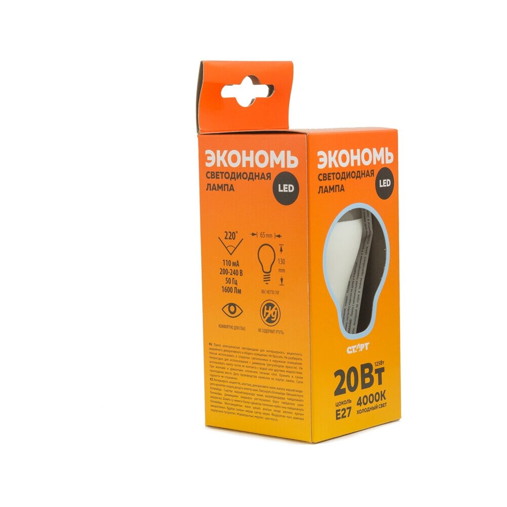 Лампа светодиодная Старт LED, серия "ЭКО" 20W40, тип А "груша", Е27, 4000К, холодный свет. 15000ч
