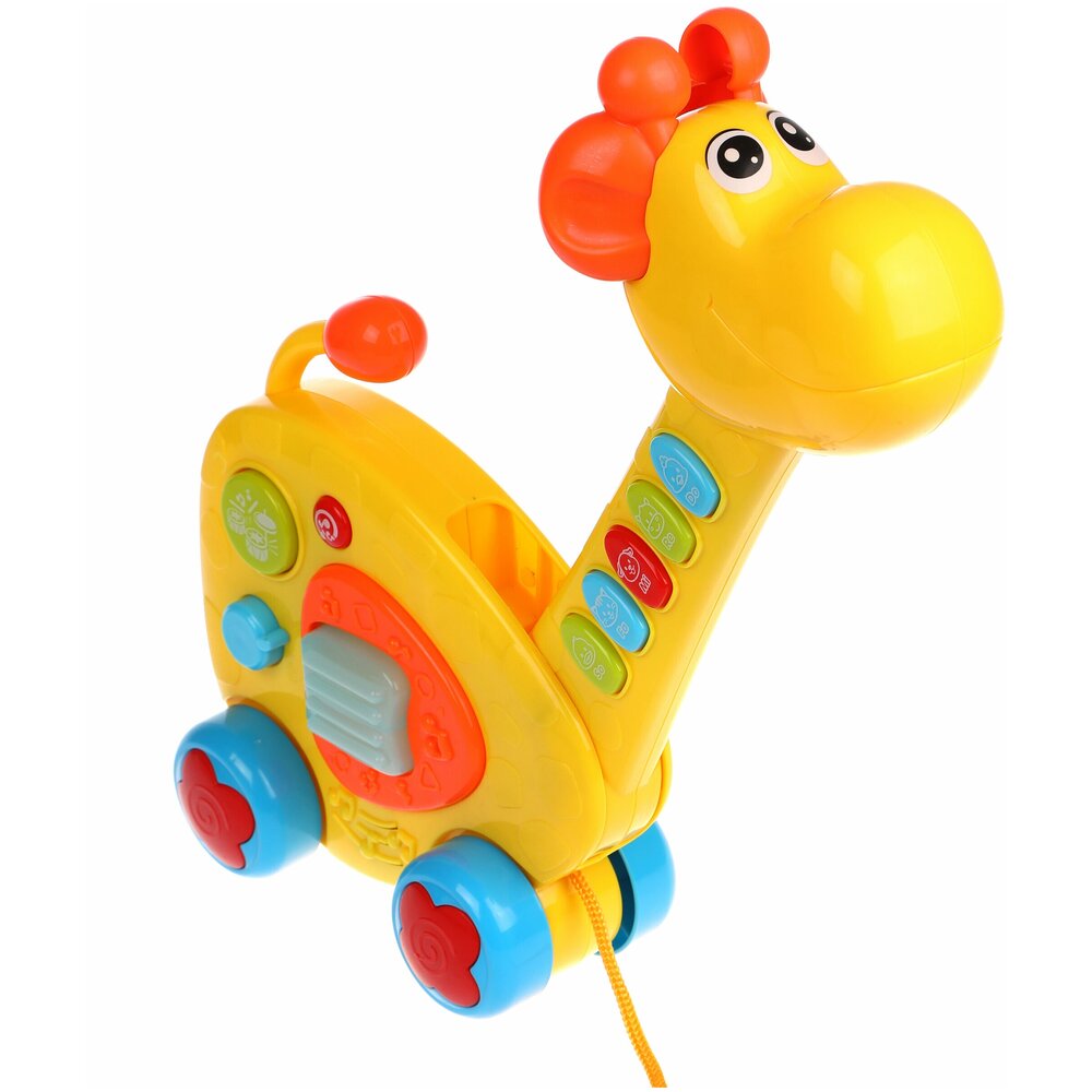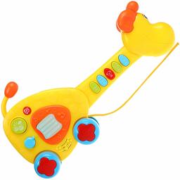 «Весёлый жирафик» – это и гитара для малыша, и каталка, сразу две игрушки в одной! Как это происходит? Угол наклона шеи забавного жирафика регулируется, таким образом, его можно трансформировать из одной игрушки в другую. Если поставить шею жирафа в горизонтальное положение, она станет грифом электрогитары. Музыкальная игрушка работает в трёх режимах: мелодии, голоса животных и звуки пианино. Режимы переключаются кнопкой с нотками. В режиме «пианино» маленький гитарист сможет придумать и сыграть свою собственную мелодию, нажимая на клавиши. Как здорово! А если потянуть шею жирафика вверх, он превратится в забавную каталку на верёвочке. Уровень громкости регулируется. В игрушке предусмотрены яркие световые эффекты! Функции работают от 3-х батареек типа АА на 1,5 V (не входят в комплект). Размер игрушки (ДхШхВ): 20х6х41 см. Изделие изготовлено из полимерных материалов. Рекомендованный возраст: 9 месяцев +