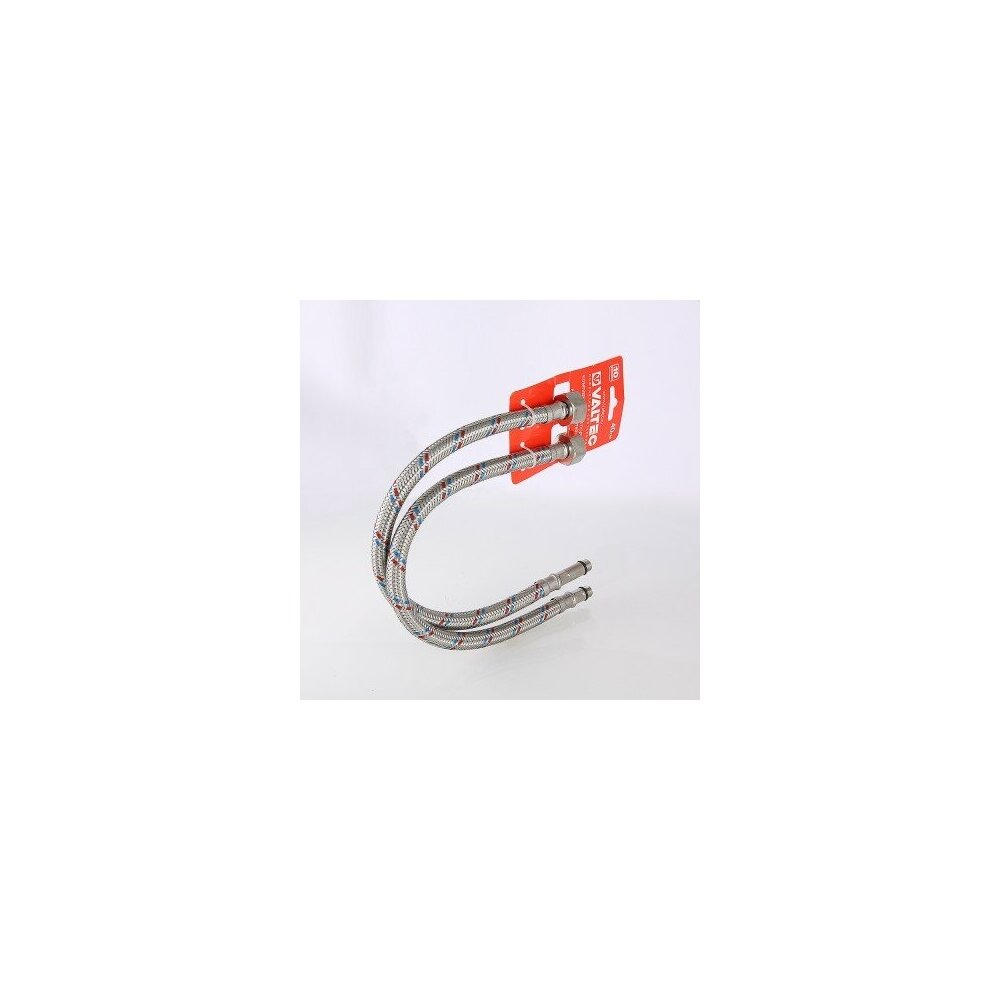 (VTf.005.IS) Комплект гибкой подводки для подключения смесителя объединяет в себе пару подводок гибких VALTEC c концевыми элементами гайка–штуцер, 1/2” х M10, длина штуцера – 18 и 35 мм (такое сочетание обеспечивает удобное подсоединение подводки). Подводки гибкие для воды VALTEC рассчитаны на эксплуатацию при рабочем давлении 10 бар (максимальное давление – 20 бар) и температуре от 1 до 95 °C (максимальная температура – 100 °C). Внутренний диаметр шланга – 8,5 ± 0,5 мм. Закладной ниппель, накидная гайка, пресс-гильзы и оплетка подводки изготовлены из нержавеющей стали AISI 301. Использование ниппеля из нержавеющей стали позволило исключить излом этого элемента, повысить надежность всего изделия. Диапазон длины предлагаемых подводок – от 30 до 150 см. Это позволяет пользователю подобрать оптимальный комплект для подключения смесителя.