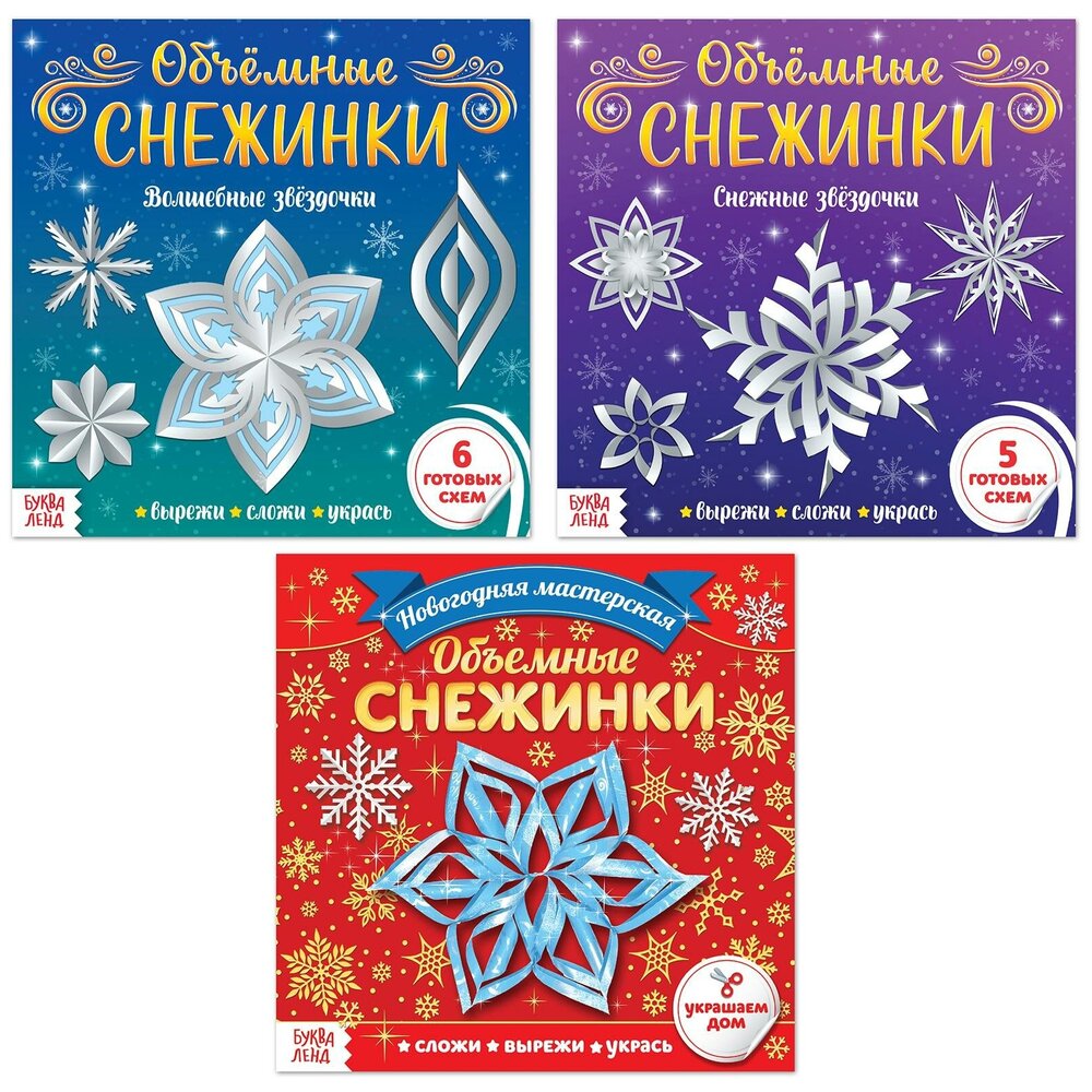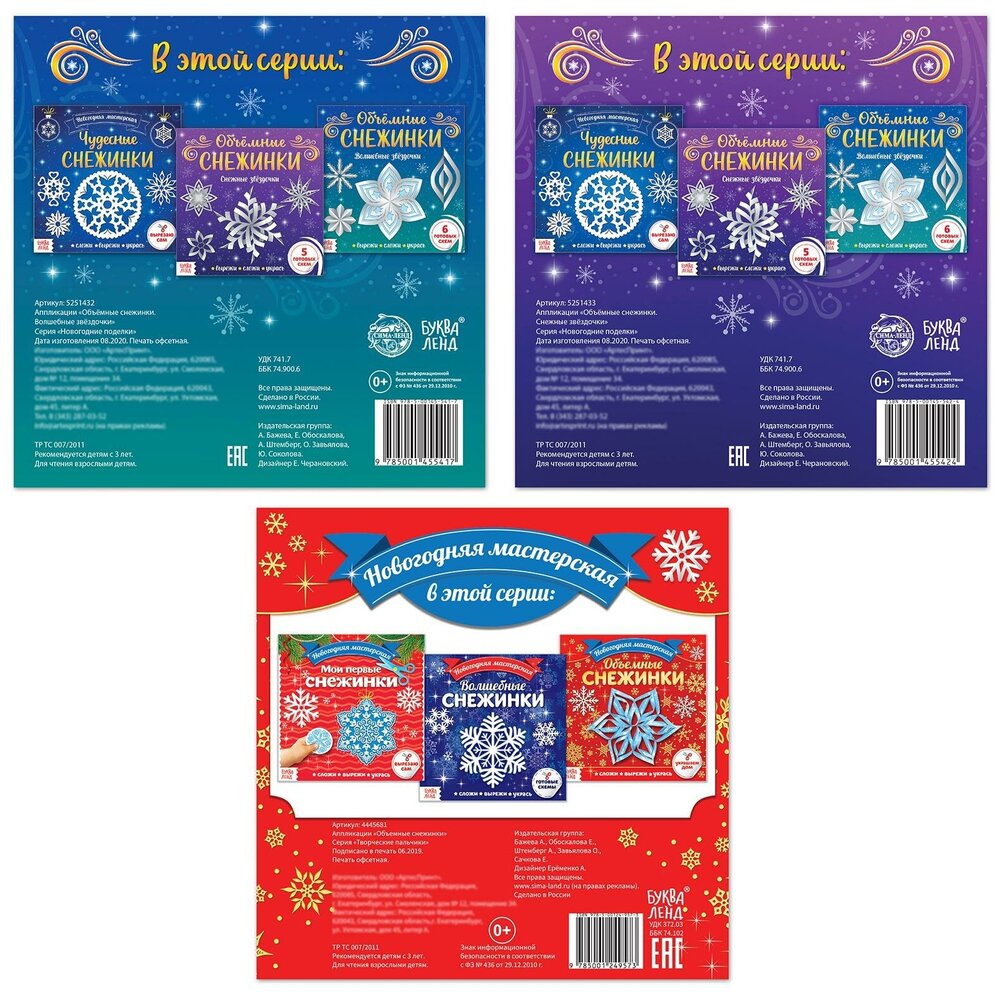 С помощью ножниц ребёнок вырежет праздничный декор по заготовленным схемам, а затем украсит комнату получившимися снежинками. "Комплектация Аппликации «Объёмные снежинки. Волшебные звёздочки», 20 стр. Аппликации «Объёмные снежинки. Снежные звёздочки», 20 стр. Аппликации «Объёмные снежинки», 20 стр."