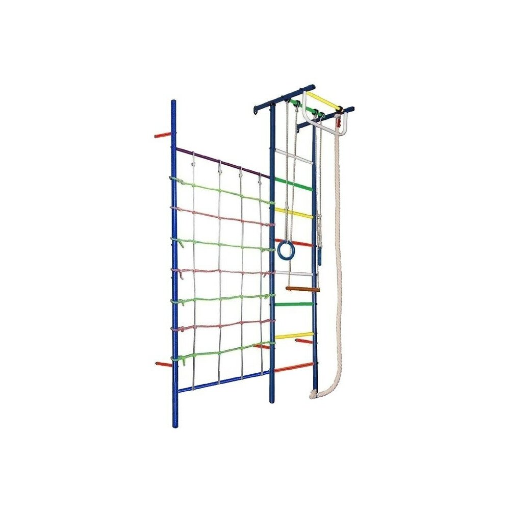 Базовая комплектация: цветные перекладины, турник с узким хватом, металлическая шведская стенка, канат, кольца гимнастические, трапеция, турник с сеткой 1х2 метра добавлена нижняя труба-опора Ширина перекладин шведской стенки - 450 мм. Устанавливается креплением к стене, высота - 2.35 м. Площадь 570 х 650 мм. + 1000 мм. в сторону. Стальная круглая труба 40х1,5 мм и 40х2 мм Стальная круглая труба 25х1,5 мм Вес комплекса не более 27 кг. Стойки выполнены из стальной трубы диаметром 40 мм. нагрузка на один элемент конструкции 90 кг нагрузка на шведскую стенку 120 кг