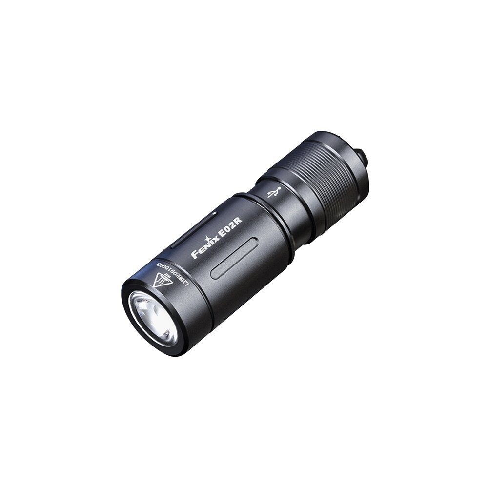 Описание фонаря Fenix E02R Cree XP-G2 S3: XФонарь Fenix E02R Cree XP-G2 S3 xANSI Максимальный Минимальный AЯркость 200 люмен* и15 люмен Время работы и25 минут 6,5 часов ЯДистанция 49 м 13 м Ударопрочность 1 м 5Водонепроницаемость рIP68, погружение в воду до 2 метров Размеры ,48 мм (длина) х 15 мм (диаметр корпуса) х 14 мм (диаметр головы) Вес 15 г (без элементов питания) Комплектация Фонарь Fenix E02R, кольцо для ключей, запасное уплотнительное кольцо, кабель Micro USB, руководство пользователя, талон гарантии. мЭлементы питания Встроенный Материал корпуса Авиационный алюминий гПокрытие корпуса иПремиум покрытие III степени иВключение Поворотное кольцо 2Модель Fenix E02R являет собой аккумуляторный прибор, который окажет пользу в качестве брелка на ключи. Одно из основных преимуществ фонаря – его компактные размеры. Весит он не более 15 грамм. Такой миниатюрный фонарик даёт световой поток в 200 люменов, а дистанция распространения луча достигает 49 метров. Функционирует со встроенным аккумулятором ёмкостью в 120 миллиампер-часов. Литий-полимерный аккумулятор обеспечивает работу фонарика, а освещение получается за счёт применения светодиода Cree XP-G2 S3. Освещение – белого цвета. Предусмотрен порт micro-USB для подзарядки аккумулятора. йФонарь оснащается линзой с отражающим напылением, гарантирующей высокую эффективность освещения. Fenix E02R изготовлен из прочного материала, коим является алюминий марки А6061-Т6. Он предлагается пользователям в трёх разных дизайнах. Есть на выбор варианты с чёрным, синим, бронзовым цветами корпуса. .Детальнее о характеристиках и работе Fenix E02R. уУправляется компактный фонарь при помощи поворота его головной части. Чтобы включить фонарик, следует затянуть головную часть. Для выключения – действие обратное, ослабьте головную часть. Для выбора режимов освещения поверните головную часть. Сначала активизируется Минимальный режим, затем, если продолжать поворот «головы» модели, то можно перейти к Максимальному режиму. 0Яркость наибольшая в Fenix E02R предусмотрена на уровне 200 люменов. Такого светового потока хватит для обозревания ближайших предметов и ориентировки в пространстве, к примеру, на улице. Наименьший уровень освещения – 15 люменов. В Максимальном своём режиме фонарь способен функционировать на протяжении 25 минут, преодолевая лучом расстояние в 49 метров. Интенсивность достигает 591 кандел. В Минимальном режиме Fenix E02R освещает на дистанции в 13 метров, интенсивность составляет 39 кандел. Время работы в этом режиме – шесть с половиной часов. Необходимо упомянуть, что данные о работе модели удалось получить в ходе осуществления лабораторных опытов. Фонарь проходил проверку с литий-полимерным аккумулятором при температуре порядка 21 градуса Цельсия (плюс-минус три градуса), а влажность воздуха достигала 50-80 процентов. Реальные параметры работы фонаря могут отличаться в зависимости от того, каковы условия среды, а также от применяемых элементов питания. оДля того, чтобы зарядить фонарь, необходимо открутить головную часть. Откроется зарядный порт. Вставьте USB A разъём кабеля в адаптер питания, после – micro USB штекер в модель. Во время зарядки модели индикатор будет светиться красным. Когда же заряда достаточно, красный цвет поменяется на зелёный. Аккумулятор зарядился. После завершения зарядки нужно закрутить головную часть, и убедиться, что соблюдена герметичнос