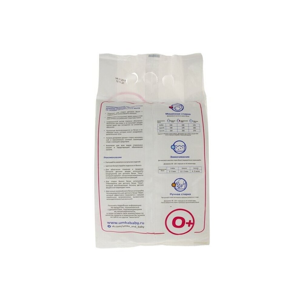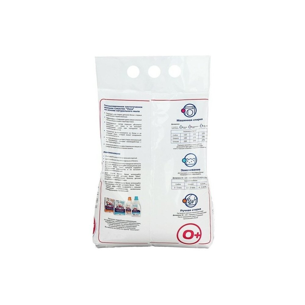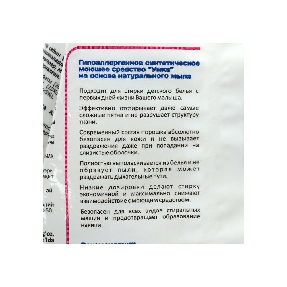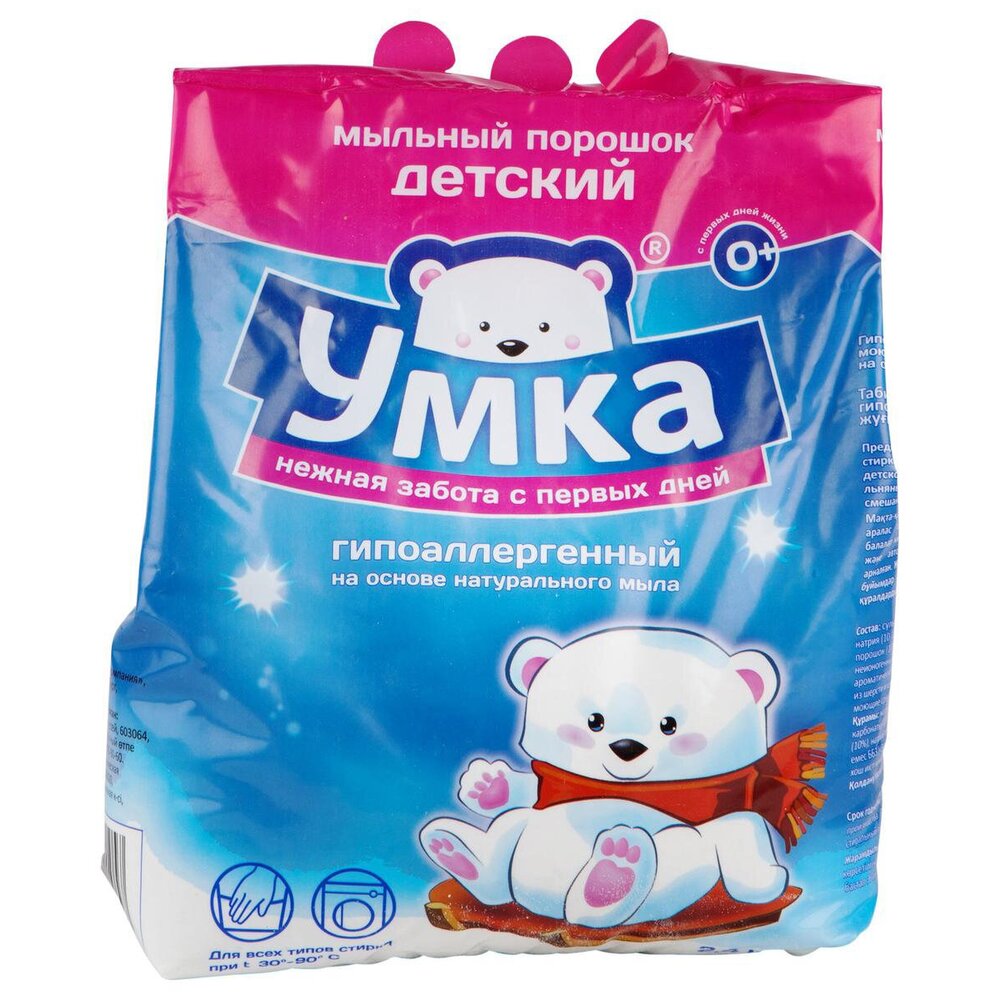Детский мыльный порошок для стирки детского белья Умка, предназначен для замачивания, ручной стирки и стирки в автоматических машинах детского белья из хлопчатобумажных, льняных, синтетических тканей и тканей из смешанных волокон.Для изделий из шерсти и шелка используйте специальные моющие средства.Подходит для стирки детского белья с первых дней жизни Вашего малыша.Эффективно отстирывает даже самые сложные пятна и не разрушает структуру ткани.Современный состав порошка абсолютно безопасен для кожи и не вызывает раздражения даже при попадании на слизистые оболочки.Полностью выполаскивается из белья и не образует пыли, которая может раздражать дыхательные пути.Низкие дозировки делают стирку экономичной и максимально снижают взаимодействие с моющим средством.Безопасен для всех видов стиральных машин и предотвращает образование накипи.Состав:сульфат натрия (30-40%), карбонат натрия (10-12%), натуральный мыльный порошок (10%), перкарбонат натрия (:10%), неионогенные ПАВ (:5%), поликарбоксилаты, ароматическая композиция.,.