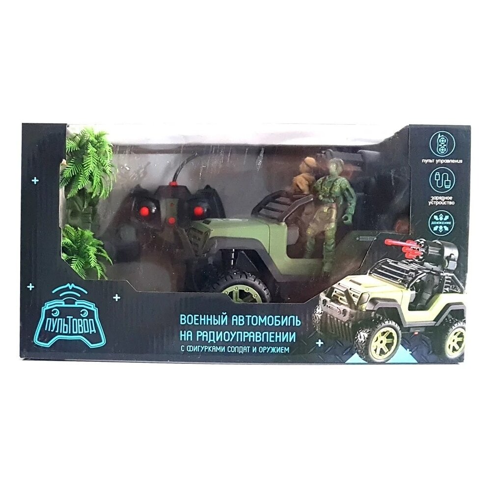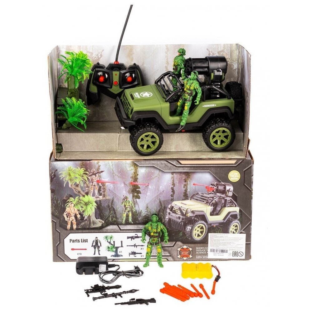 Радиоуправляемый джип Zhorya (стреляет ракетами, солдаты) - ZYB-B3022 - это военный внедорожник с фигурками солдат. Машинка имеет размер 25 х 14 х 17 см и управляется с помощью удобного пульта управления. Игра с радиоуправляемой игрушкой развивает скорость реакции, тренирует координацию движений, внимание, ловкость, тактическое мышление, способность быстро и взвешенно принимать решения. Компактные размеры внедорожника позволят малышу брать его с собой на прогулку или в гости к друзьям. Характеристики: Частота работы игрушки составляет 27,145 МГц. Радиус действия пульта управления составляет до 10 метров. Длительность работы игрушки составляет до 20 минут. Время зарядки – до 4 часов. Функционал: вперед-назад-влево-вправо, стрельба пулями. Комплектация: машинка, пульт управления, 4.8V аккумулятор, USB-зарядное устройство, солдаты - 3 шт., пули - 10 шт., дерево - 1 шт. Необходимо докупить: 2 батарейки АА 1,5V для пульта управления (в комплект не входят)