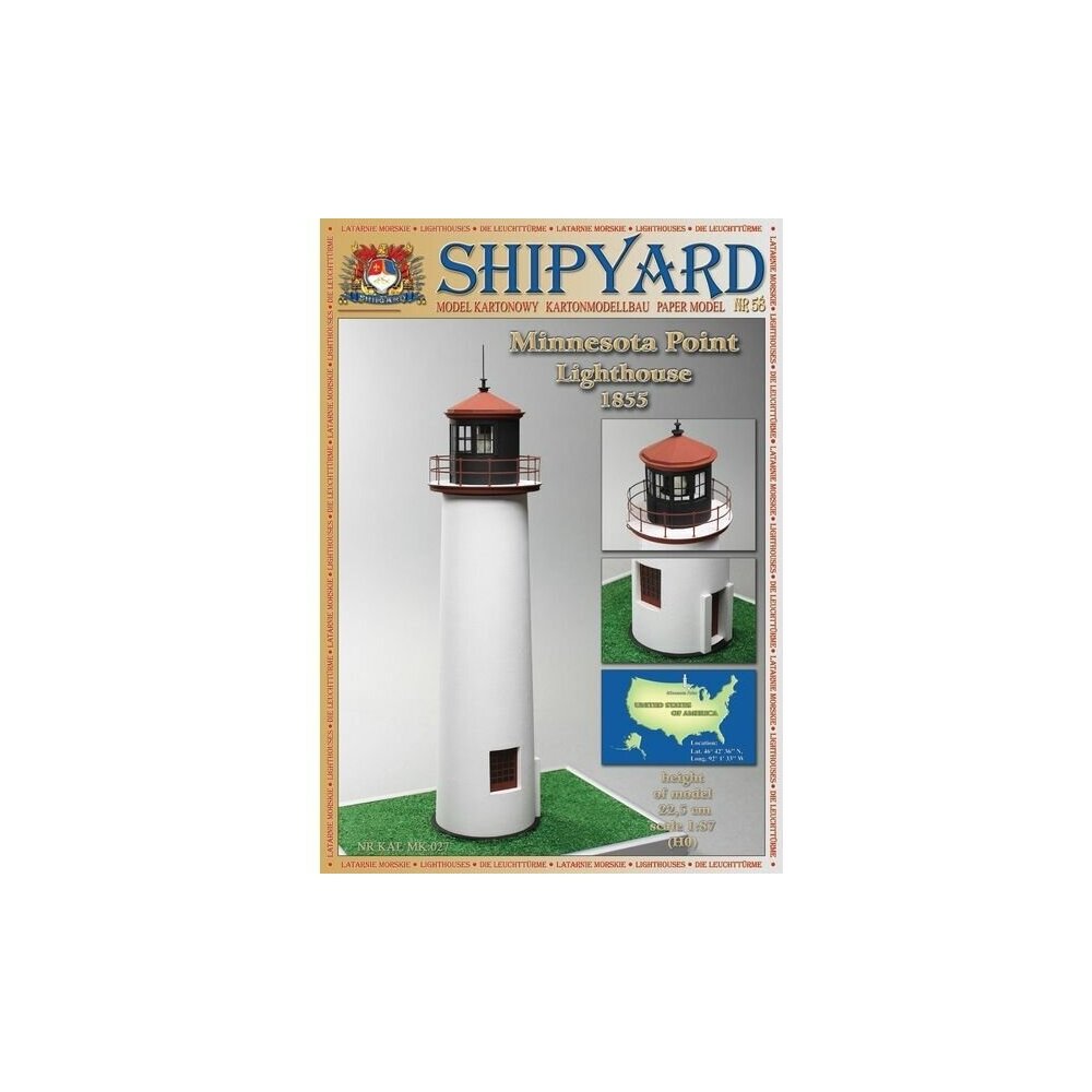 Shipyard MK027 Маяк Minnesota Point располагался в городе Duluth на западном побережье Верхнего озера на границе Minnesota и Wisconsin. Решение о его строительстве было принято в 1853 году и в 1857 году он был построен а в 1858 введен в эксплуатацию. 15 метровый маяк был построен из красного кирпича и покрыт белой штукатуркой. Он эксплуатировался до 1913 года. 27 декабря 1974 года его руины были внесены в Национальный Реестр Исторических Мест США. Бумажные модели фирмы Shipyard имеют ряд достоинств: широкий ассортимент моделей разных эпох понятная инструкция качественная полиграфия хорошая сходимость деталей наличие лазерной резки каркаса Характеристики: масштаб: 1/87 высота: 225 мм материал: бумага/картон В комплекте: каркасные детали - Shipyard даёт их уже вырезанными лазером на картоне нужной толщины бумажные детали для всех элементов модели из бумаги - 4 листа А4 логическая часть бумажной модели маяка – сборочные схемы, инструкция, историческая справка и фотографии (тут и классические схемы сборки, и фотографии, и цветная изометрия) - 7 страниц А4