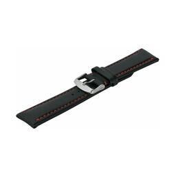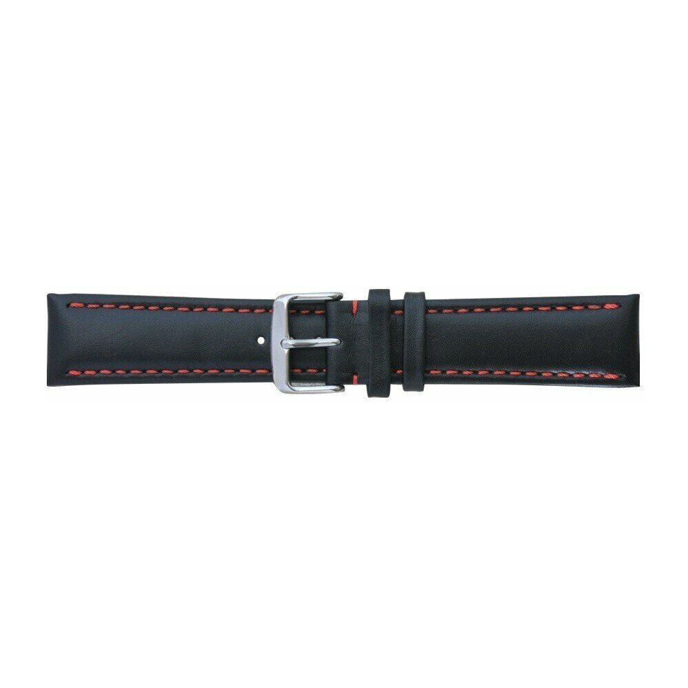Премиальный ремешок для наручных часов, 18 мм - установочный размер, чёрный, стандартной длины - R, спортивная модель, пухлая (дутая), гладкая, с красной прострочкой по краю, итальянская натуральная кожа телёнка, пряжка из нержавеющей стали (INOX), с PVD покрытием, серебристого цвета