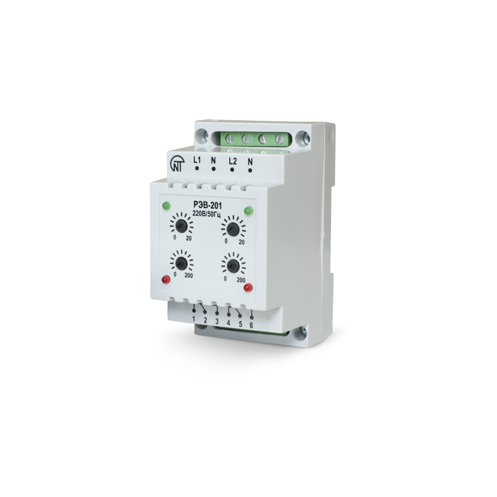 Реле времени электронное двухканальное с задержкой на включение РЭВ-201 предназначено для коммутации электрических цепей переменного тока 220 В/50 Гц и постоянного тока 24-100 В с регулируемой задержкой времени включения от 0 до 220 с. Устройство состоит из двух независимых реле времени (двух каналов). Отсчет выдержки времени каждого канала начинается с момента подачи питания на соответствующий канал. Соответствующая схемы подключения реле РЭВ-201 позволяет реализовать: - независимую работу каналов (выдержка времени отсчитывается с момента подачи питания на конкретный канал); - параллельную работу каналов (питание на оба канала подается одновременно). Задержка времени включения по каждому каналу выставляется отдельно. Каждый канал имеет две регулировки: от 0 до 20с и от 0 до 200с и время задержки срабатывания канала определяется суммой задержек, выставленных двумя потенциометрами. Зеленый светодиод соответствующего канала индицирует наличие напряжения на канале. Красный светодиод индицирует срабатывание канала. Каждый канал на выходе имеет по одному размыкающему и одному замыкающему контакту. Цепь питания реле гальванически развязана с выходными цепями.