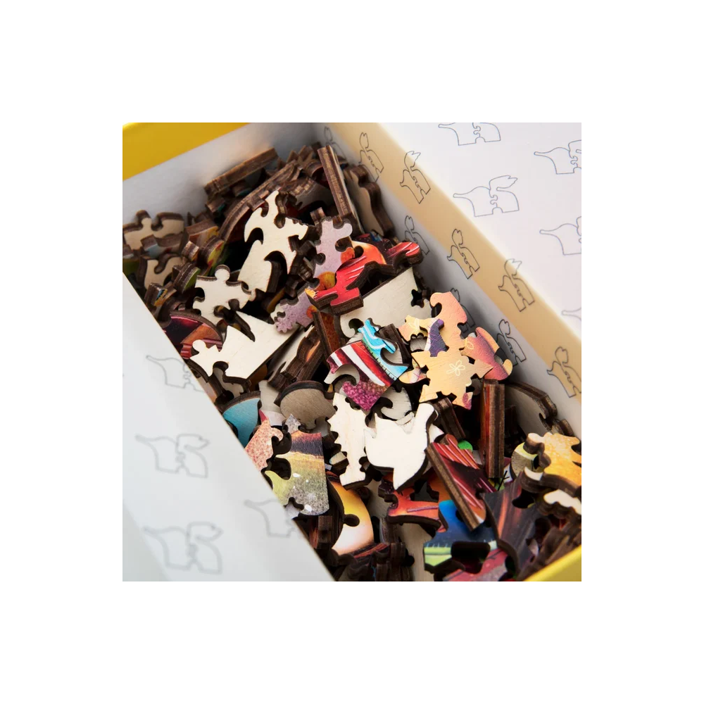 Пазл "Имаджинариум" - это и необычный способ для развития вооброжения по мотивам популярной настольной игры. Каждая деталька пазла выполнена в уникальной форме и скрывает вою историю, а вместе они складываются в яркие иллюстрации от известных художников. Начинайте собирать как обычный пазл - кусочек за кусочком,и на ваших глазах оживает красивая иллюстрация из игры "Имаджинариум" Собирать пазл довольно легко,а приятный арамат дерева добавит новую нотку удовольствия в процесс.