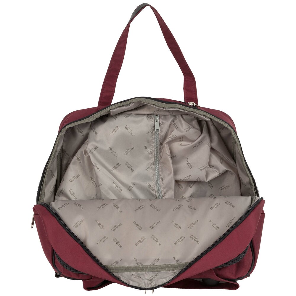 Дорожная сумка от компании "Polar" на двух колёсах выполнен из прочного полиэстера и прекрасно подходит для тех путешественников, которые предпочитают недолгие деловые командировки или поездки ". Чемодан состоит из двух отделений, которые закрываются на пластиковую молнию. В переднем отделении имеется открытый уплотнённый карман, спереди кейса-пилота располагаются два кармана на молнии, предназначенные для документов и мелких вещей, сзади есть широкая лента для фиксации сумки на ручке чемодана. У мини-чемодана есть две ручки для переноски, высота которых составляет 24,5 см и выдвижная металлическая ручка, высота которой составляет 42 см.