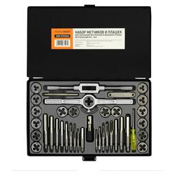 Универсальный набор метчиков и плашек М3-М12 для прогонки поврежденных и нарезания внутренних и наружных резьб. Все предметы изготовлены из инструментальной легированной стали 9ХС. Позволяет работать с цветными металлами и сталью. Набор поставляется в металлическом кейсе для удобства транспортировки и хранения инструмента. Включает 40 предметов. В комплекте: Метчики однопроходные: М3х0.5; М3х0.6; М4х0.7; М4х0.75; М5х0.8; М5х0.9; М6х1.0; М6х0.75; М7х1.0; М7х0.75; М8х1.25; М8х1.0; М10х1.5; М10х1.25; М12х1.75; М12х1.5; 1/8NPT27 – 17 шт. Плашки: М3х0.5; М3х0.6; М4х0.7; М4х0.75; М5х0.8; М5х0.9; М6х1.0; М6х0.75; М7х1.0; М7х0.75; М8х1.25; М8х1.0; М10х1.5; М10х1.25; М12х1.75;М12х1.5; 1/8NPT27 – 17 шт. Метчикодержатель М3-M12 – 1 шт. Метчикодержатель T-образный цанговый: М3-М6 – 1 шт. Плашкодержатель 25 x 9 – 1 шт. Отвертка шлицевая 3.5 х 0.6 – 1 шт. Набор щупов для измерения шага дюймовой резьбы – 1 шт. Металлический бокс 290 х 30 х 180 мм – 1 шт.