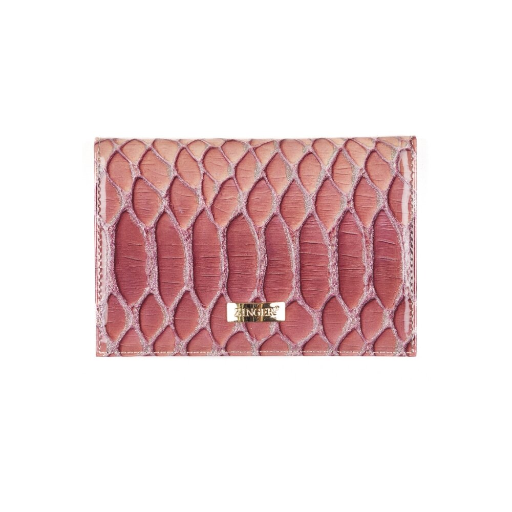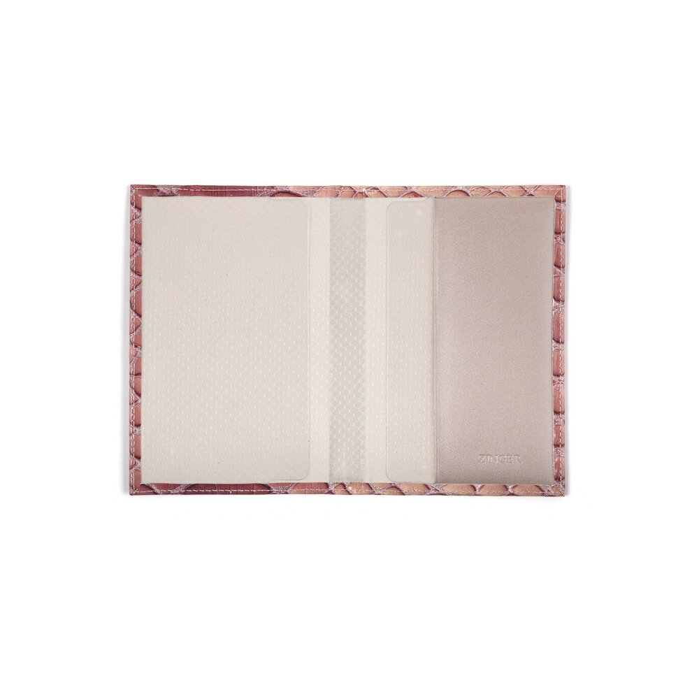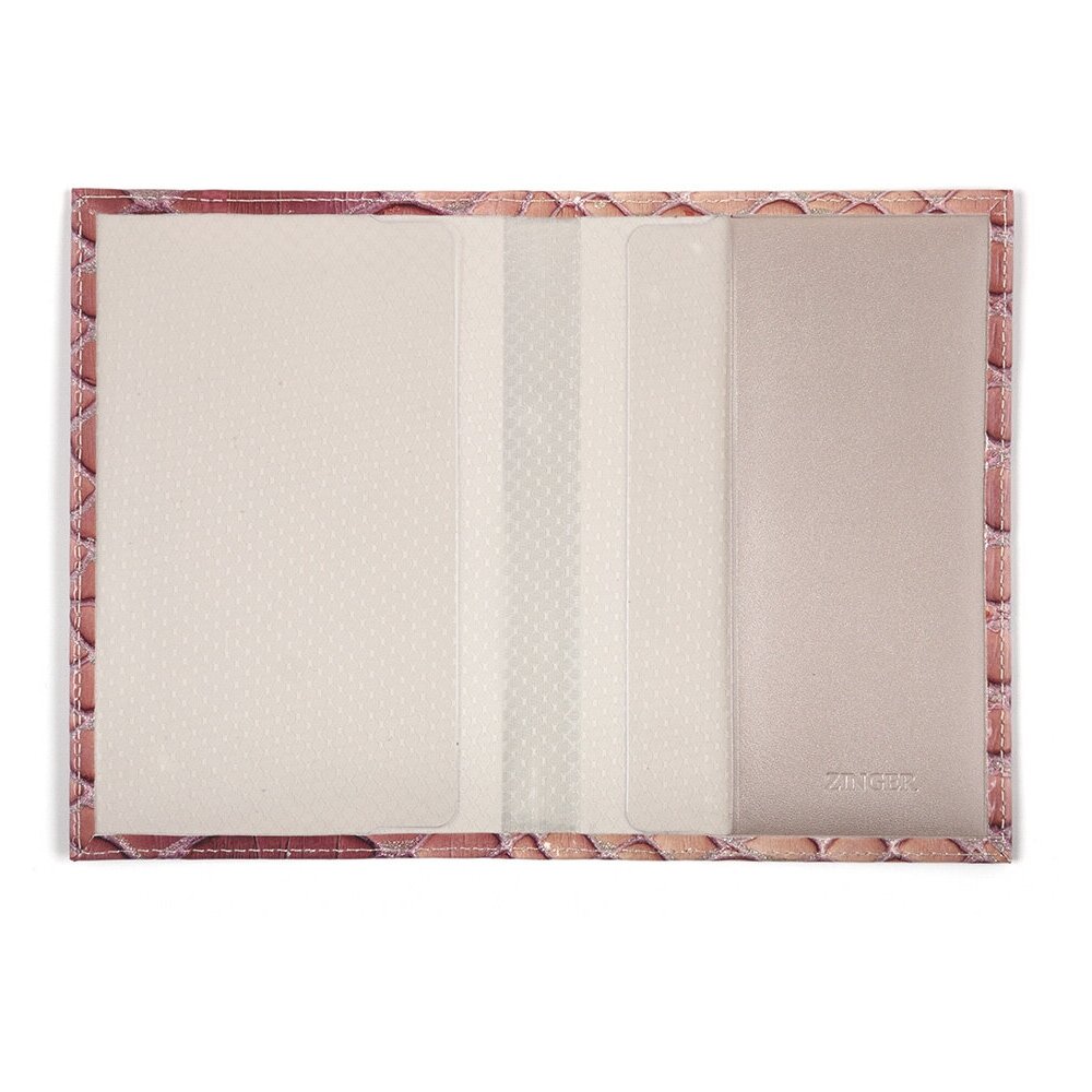 Обложка для паспорта женская из натуральной кожи. Внутри, на передней стенке пластиковый карман, на задней стенке 1 пластиковый и 1 кожаный карман. На наружной стороне обложки, металлический шильд с фирменным логотипом "Zinger" Р-р 138х93х10