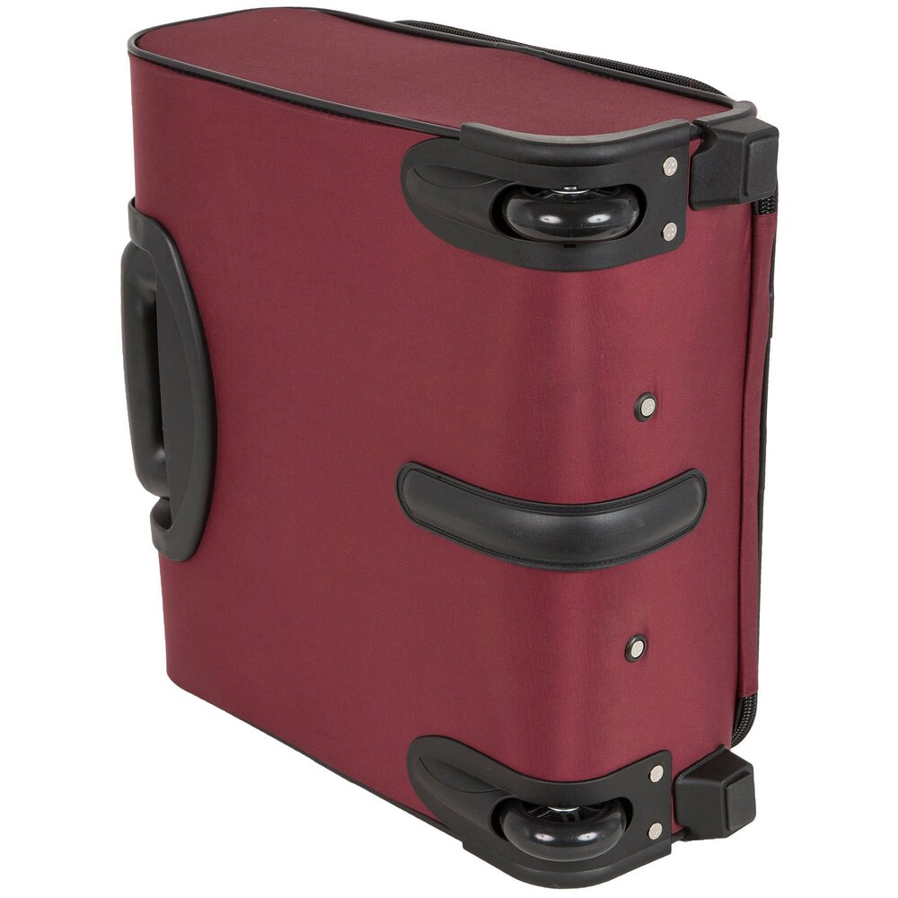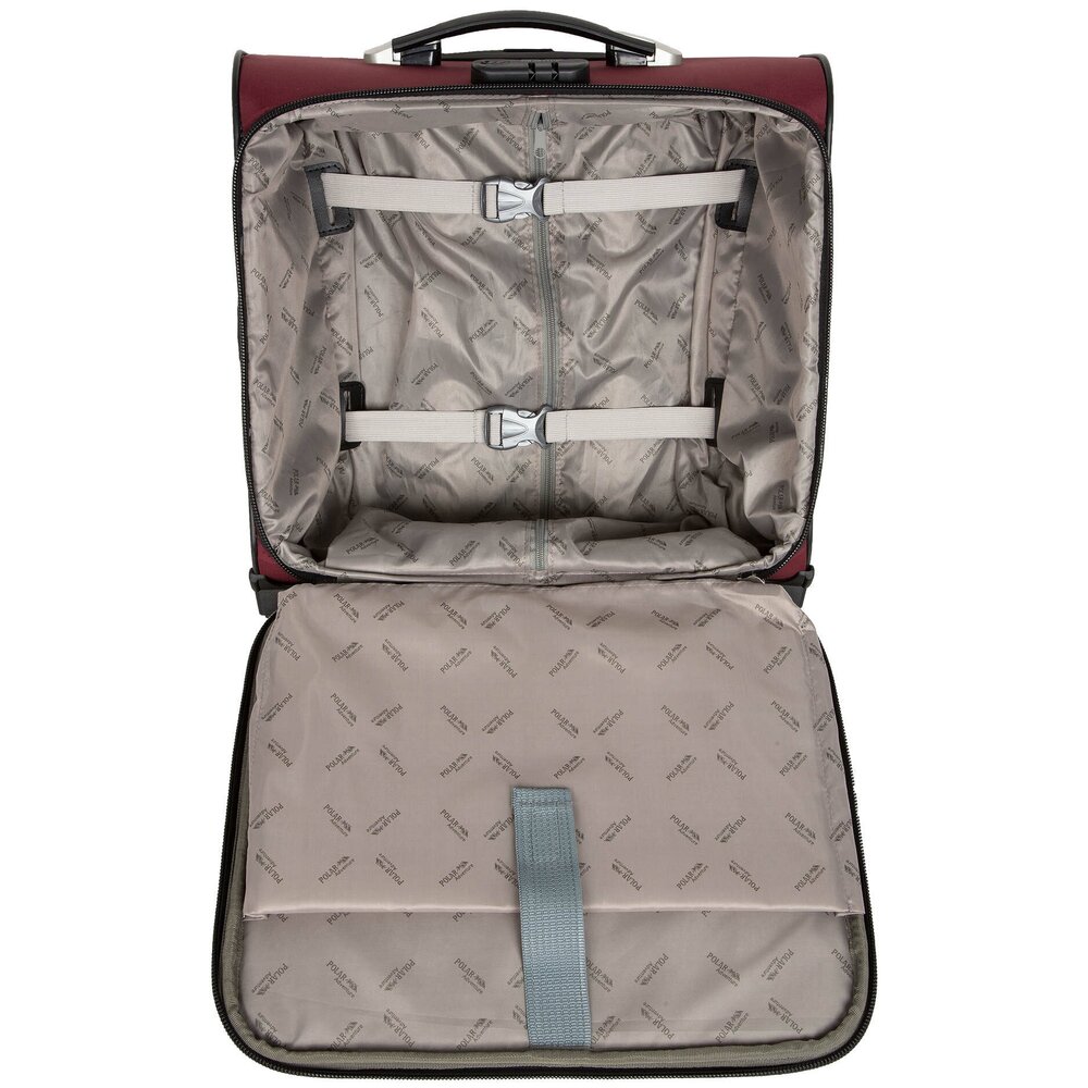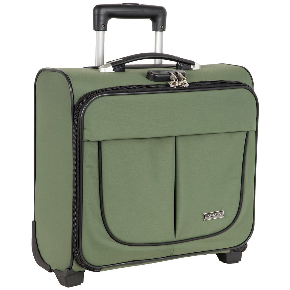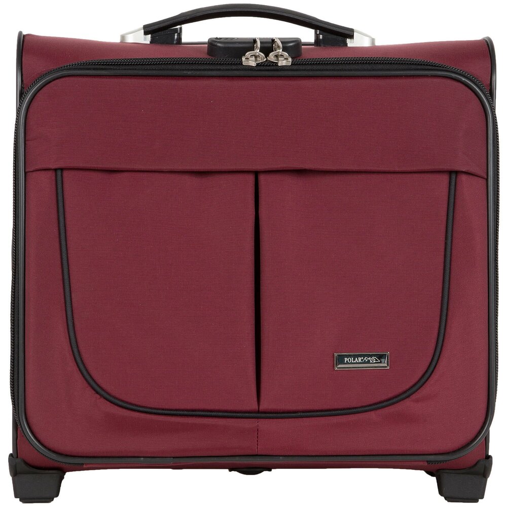Чемодан от компании "Polar" на двух колёсах выполнен из прочного материала (нейлона и полиэстера). Подходит как ручная кладь. Чемодан закрывается на молнию, присутствует также встроенный кодовый замок.Внутри есть одно большое отделение , в котором присутствуют ремни для фиксации вещей, отделение для ноутбука и маленький карман на молнии для документов. Снаружи расположен объёмный карман на молнии для мелких вещей. У чемодана есть небольшая ручка для переноски и металлическая ручка, которая выдвигается на 50см.